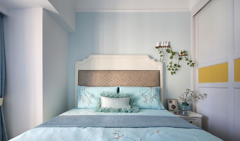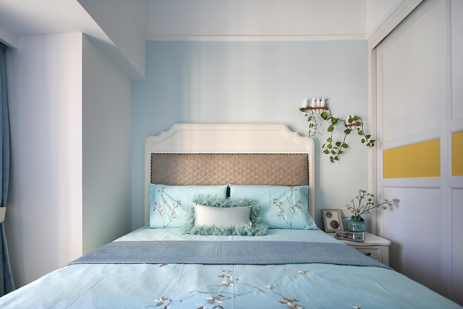 主臥室墻面不似客廳的暖米色,而是選用了米白色;地面也鋪滿沉穩(wěn)溫潤(rùn)的木色地板,搭配上藍(lán)綠色的床品,瞬間注入浪漫的基調(diào);床頭用藍(lán)白對(duì)比色也烘托出滿室的溫馨優(yōu)雅。