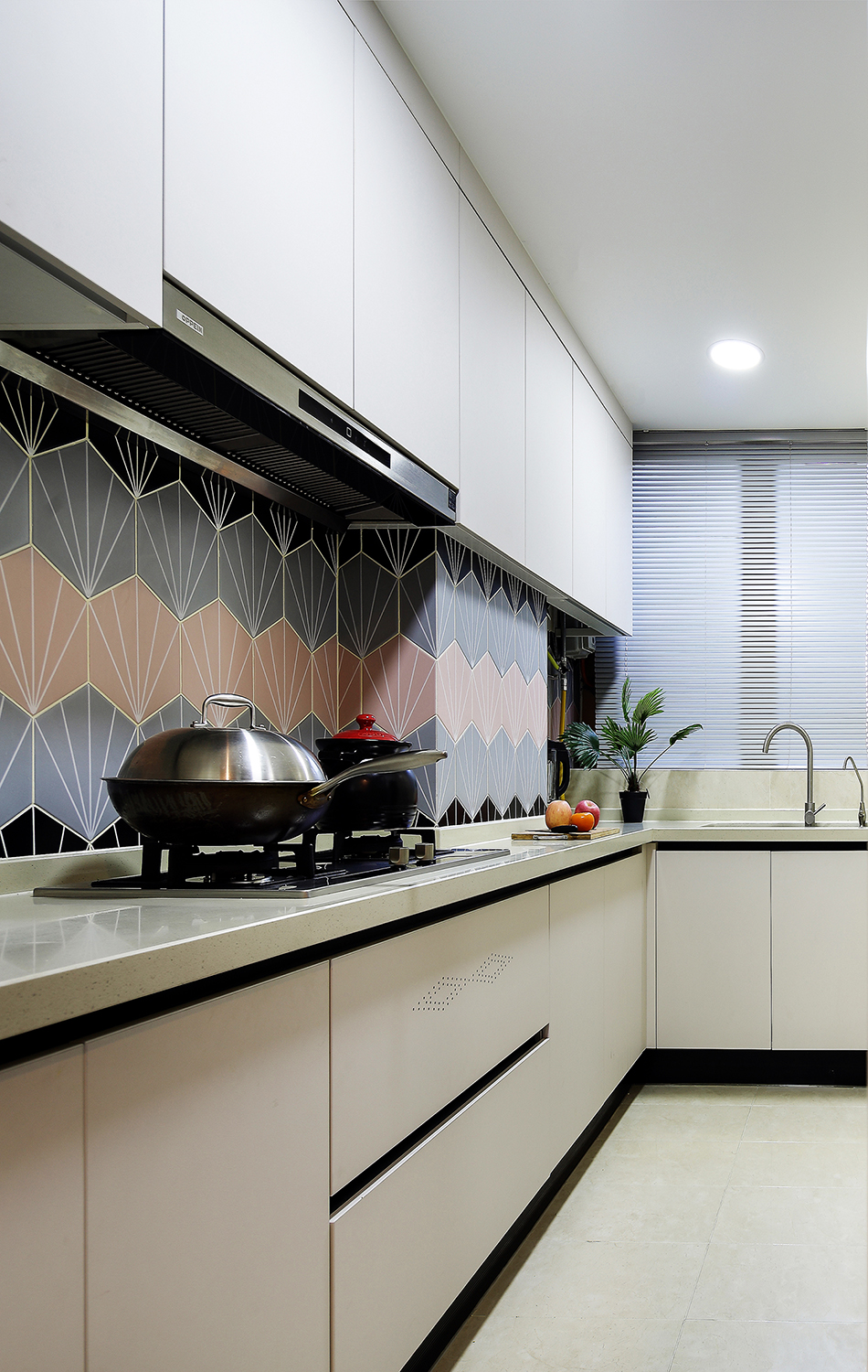 L型廚房,半開(kāi)放的空間,沒(méi)有轉(zhuǎn)角的尷尬,簡(jiǎn)單又實(shí)用。中間選用五彩不斑斕的墻磚,不一樣的紋理,是溫度與色澤的點(diǎn)綴,怡然自得。