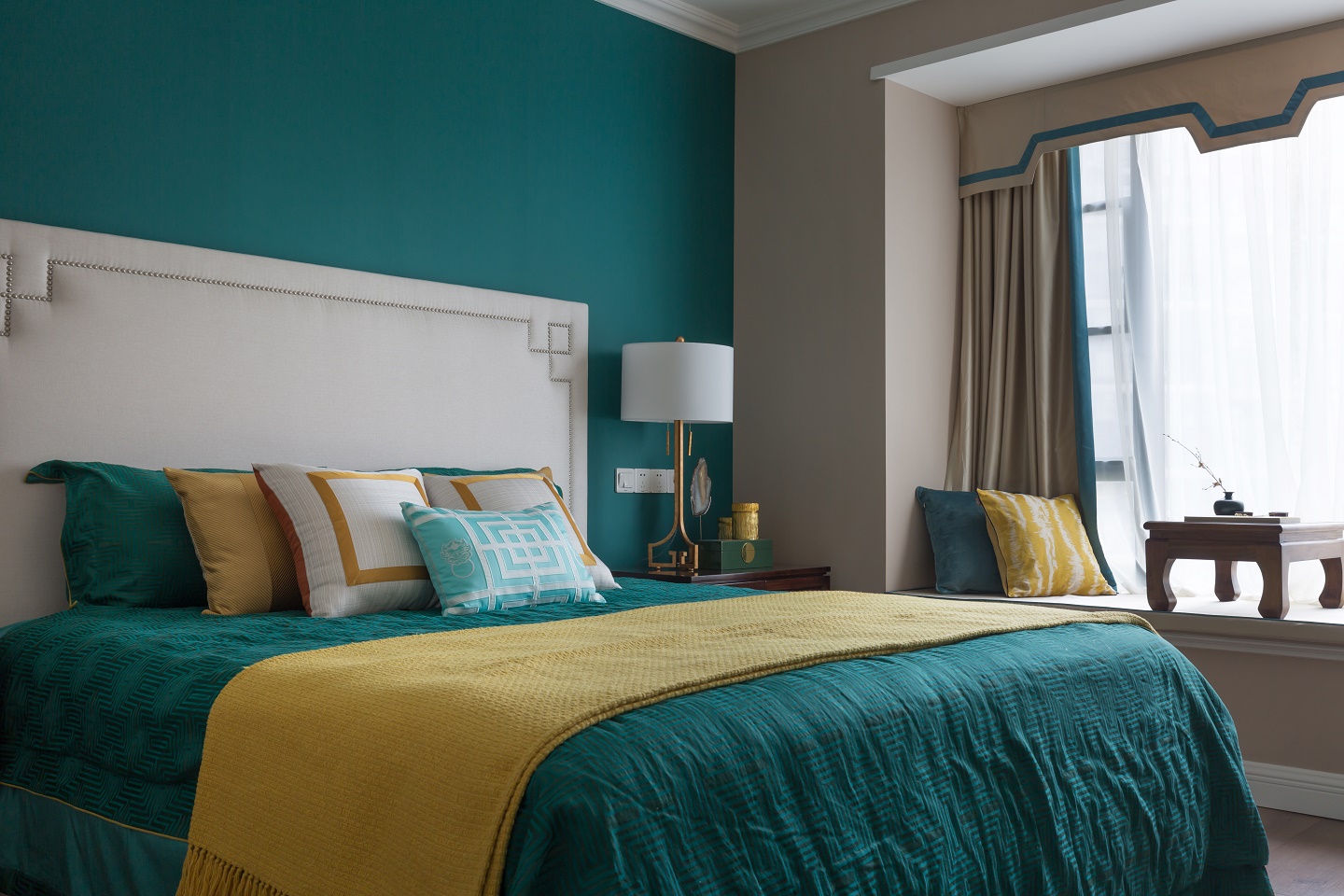 主臥大面積采用淺咖色調(diào),床頭背景則使用孔雀綠做對(duì)比,為空間平添一抹優(yōu)雅與高貴,也帶來了深邃感與寧?kù)o氛圍。