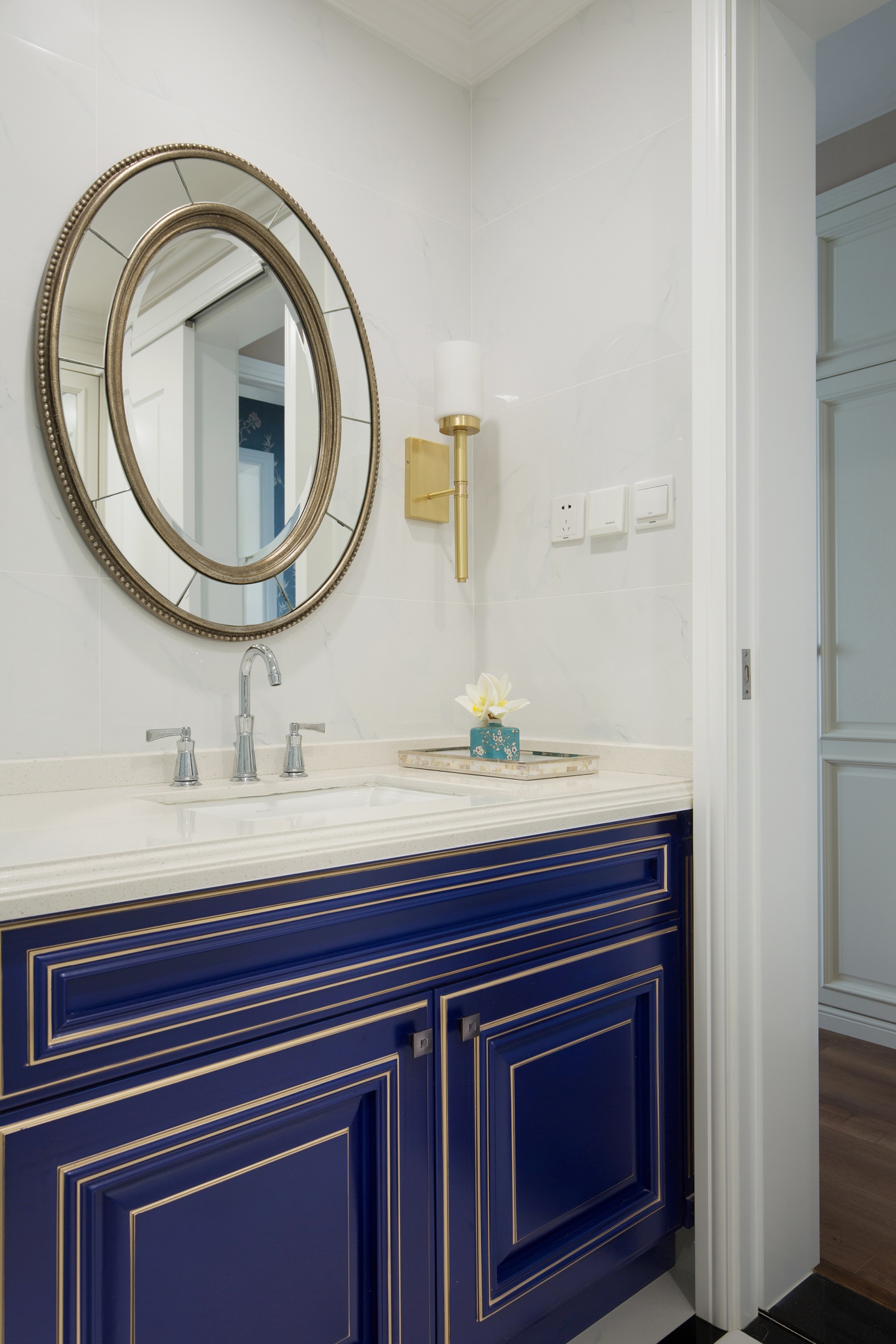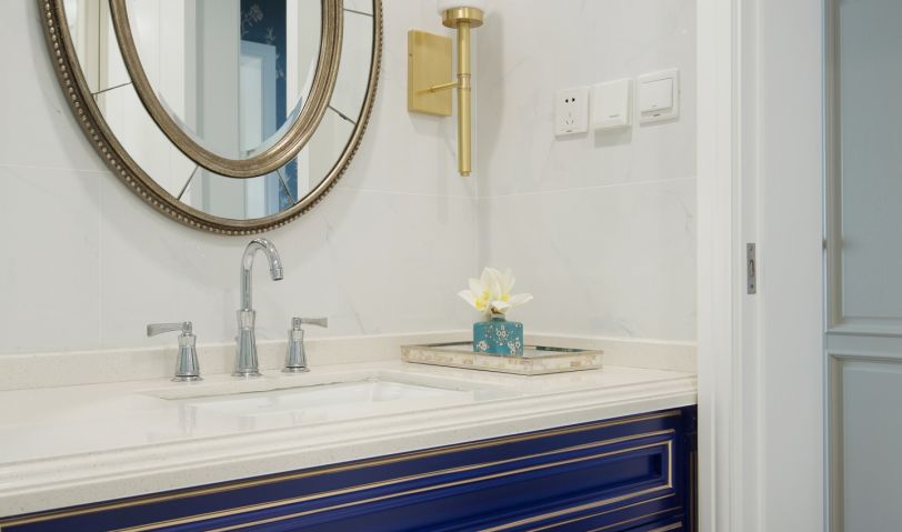 洗漱間的寶藍(lán)色浴室柜,搭配明黃色圖案壁紙,運(yùn)用對(duì)比色使空間典雅、靈秀。