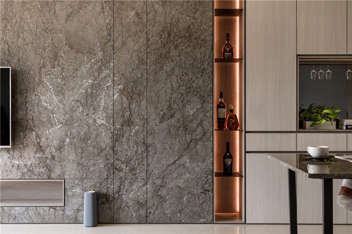 墻壁面天地溝縫的表現(xiàn),展演著精湛的工藝,品味設(shè)計(jì)的重點(diǎn)在細(xì)節(jié)而不在堆砌,透過一道木作隱藏式推拉門區(qū)隔輕食區(qū)與廚房。因應(yīng)現(xiàn)代人飲食習(xí)慣,打造隨時(shí)可與客廳互動的開放式中島,并將中島、客制化餐桌串聯(lián),獲得更寬闊的使用臺面,臺面底部安排電器、烤箱等設(shè)備收納。在與電視墻之間的接縫畸零處、善用其深度打造品酒置放架,讓餐區(qū)既是歡聚小酌的地方,也是主婦愛用的輕食料理天地。客制化餐桌使用意大利灰網(wǎng)石與白色島臺搭配,呼應(yīng)了電視墻為空間主題定調(diào)。餐廳區(qū),于餐桌上方將酒杯吊架結(jié)合燈光照明,充分體現(xiàn)設(shè)計(jì)巧思,以最精簡的形式落實(shí)實(shí)用功能,并美化場域風(fēng)貌。