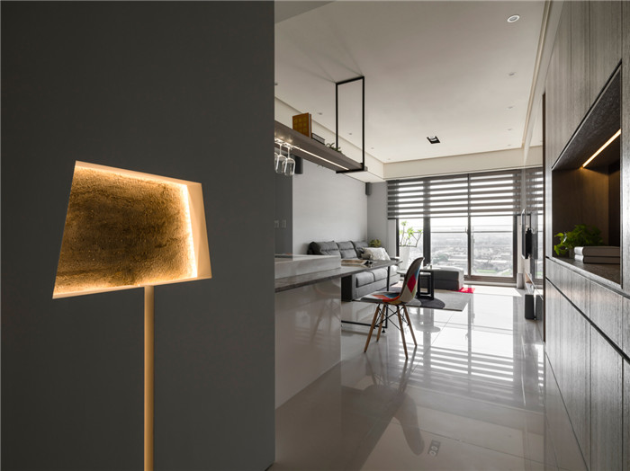 空間主軸就從進(jìn)門的一盞燈開始,木作嵌壁立燈造型,以閃銀灰色礦石巖片為底,讓墻多了創(chuàng)意變化。