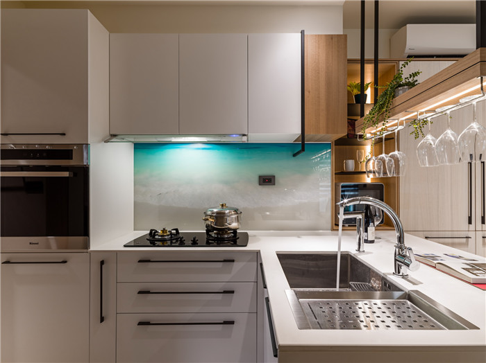 餐廚區每一項柜體尺寸到收納形式,都經過縝密規劃,在料理臺墻面加入彩印玻璃,印出藍色海灘的意象,讓沒有窗戶的廚房、也能納入浪漫的海景畫面。餐廚領域依照一家人需求量身訂制,考慮到人口簡單,于是以吧臺取代餐桌。