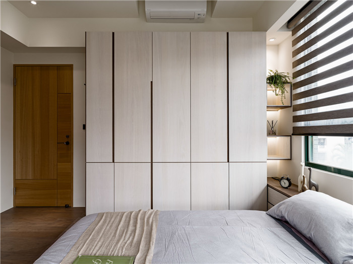 讓兩間臥房都顯得較小,於是在主臥內,選擇架高地坪、以貼地的床具形式保留開放感。窗面採光的明亮進駐,使房內絲毫不覺封閉、反倒顯得具有呼吸感,簡約中更注重細節,得以彰顯品味。刻意不施作到頂的量體,收納功能更人性化也避免過重壓迫感,玫瑰金床頭吊燈,為主臥室增色許多。衣柜門片延續全空間精細的現場作工貼皮,也舍棄五金拉手由木工藝暗拉手取代,兼顧了功能與線條構圖,全現場打造木工藝一體成形的複合式床架,把單層空間作出雙層有效利用,藉著機能的向上延伸,以及無所不在的收納機能,徹底激發小空間的坪效。