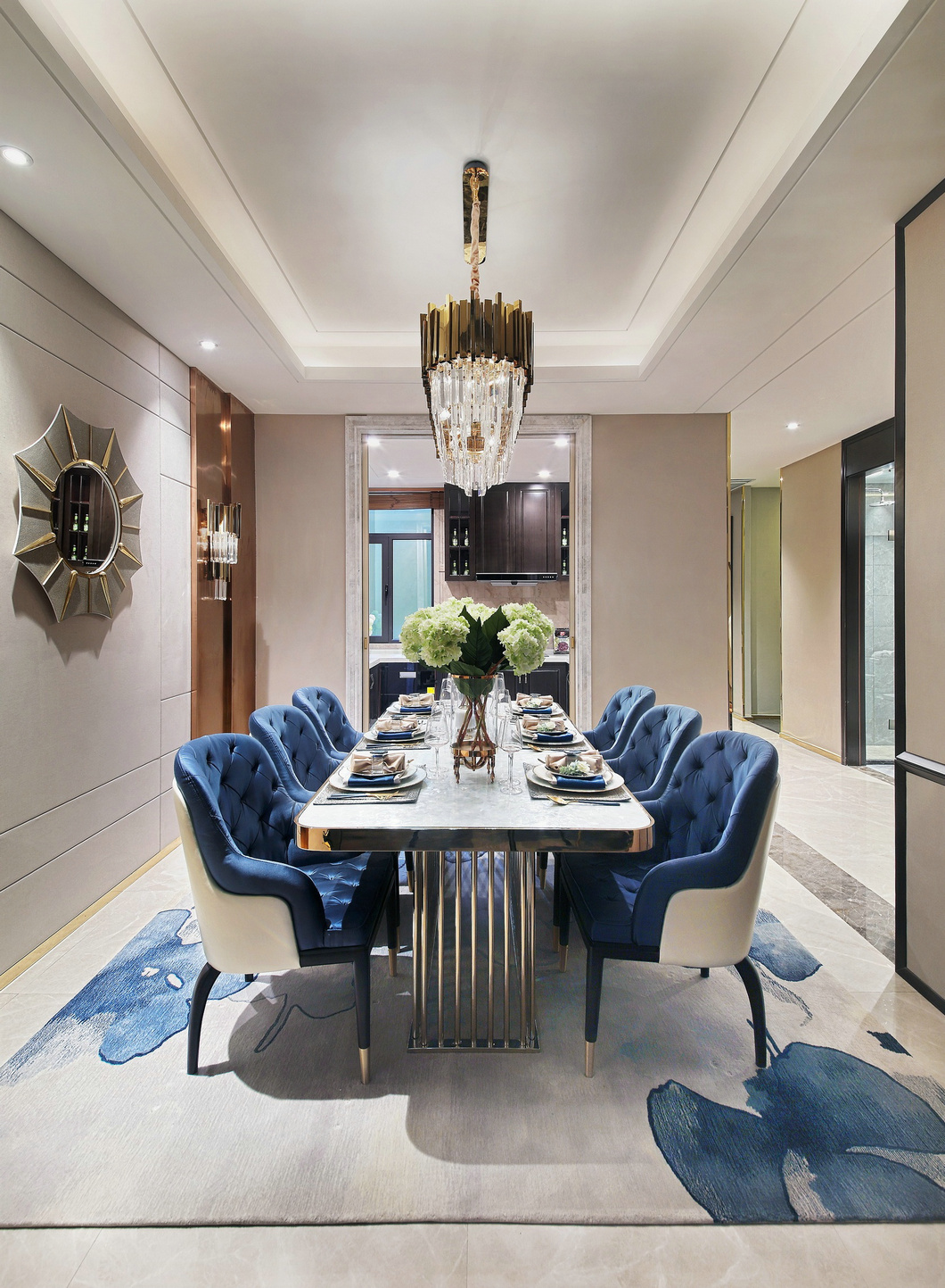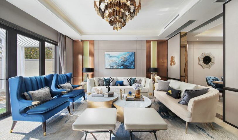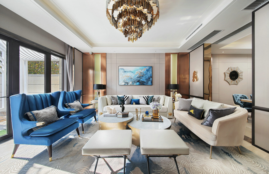 客廳以白色與香檳色為基礎色調,讓客廳風格顯得干凈明快,靈動的金屬光澤巧妙地塑造了客廳的空間感,讓客廳的視覺空間得到了極好的延伸和拓展。明亮的主色調搭配鮮艷藍色的點綴,讓客廳在充足的光線下煥發出充沛的朝氣與活力,令人感到溫暖而舒暢。