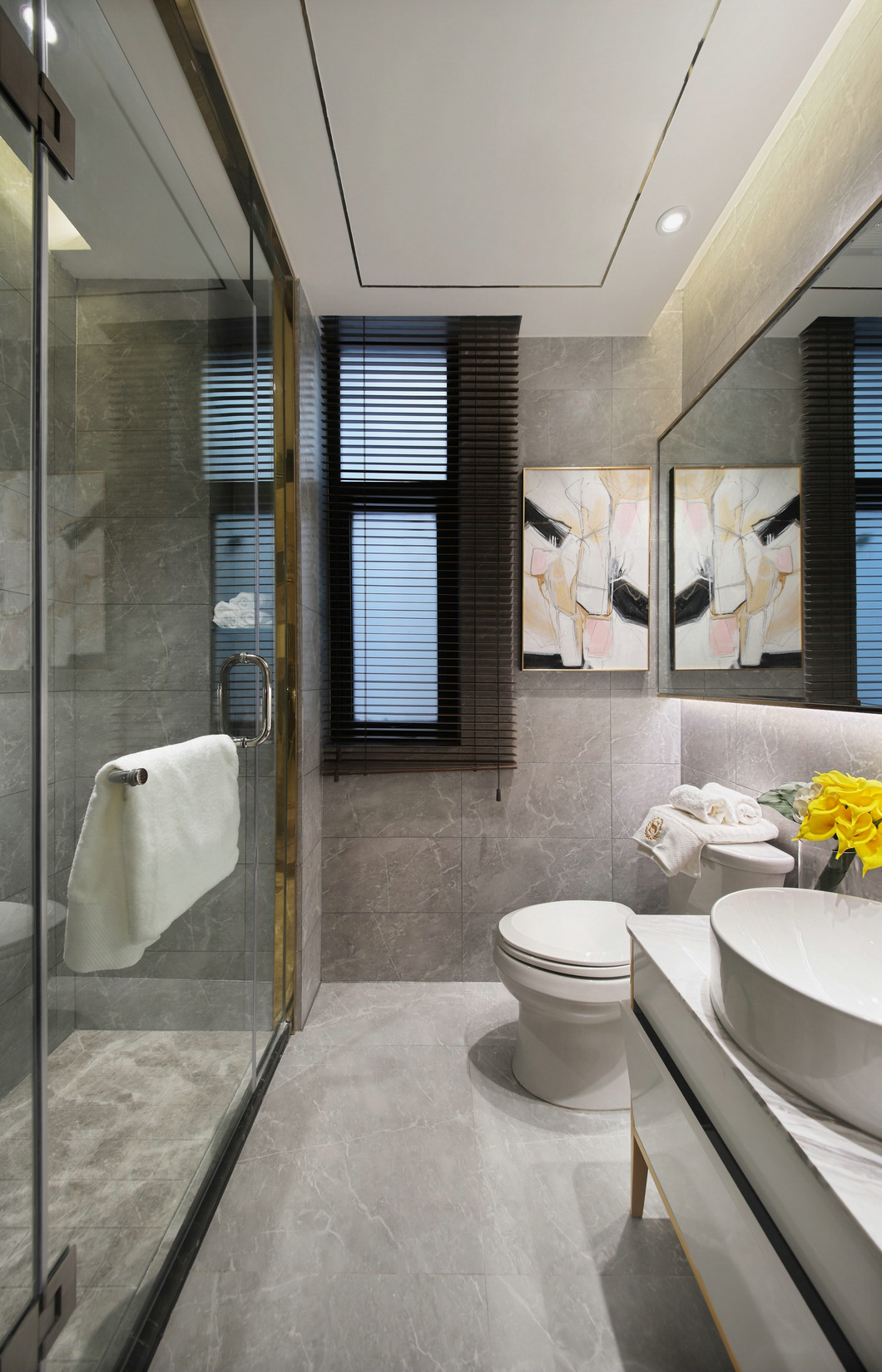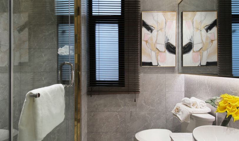 衛生間以灰白色石紋瓷磚為主體,令衛生間顯得更加干凈整潔,內部空間紋理和諧而淡雅。細膩的白瓷衛具搭配藝術壁畫為衛生間帶來清新的氣息,寬闊的壁鏡拉伸了空間廣度,拓展了視覺空間,內嵌的led燈帶來充足的光源補充,讓整個空間顯得更加明亮。