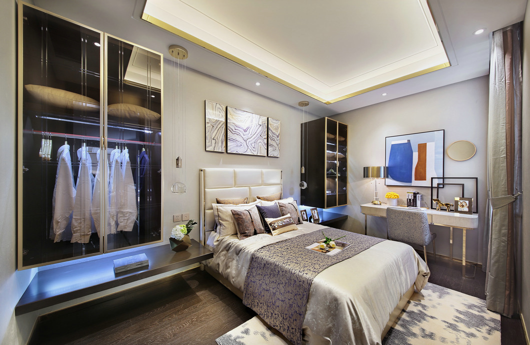 客臥以暖色調為主體,溫馨自然,有助于留宿的客人安然如夢。地上鋪設著柔軟的地毯,既美觀又起到消音的作用,夜晚在房內走動也不會打擾到別人。天花板的光源柔和而不刺眼,除了能提供充足的光亮,LED的燈光壽命更加持久且省電。床上大大小小的靠枕可以輕易消除客人的疲勞,墻上后現代主義風格的畫作讓客臥環境透露著淡淡藝術的味道。兩邊壁掛式的衣柜,節省了室內空間,玻璃柜門設計讓空間更加通透,提升了客臥的整體亮度,淡藍色的燈光打在衣柜上,夢幻且朦朧。