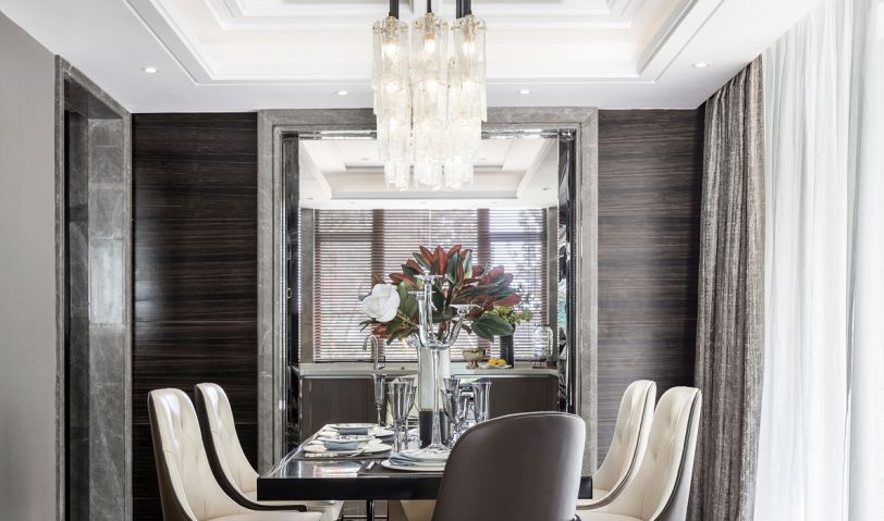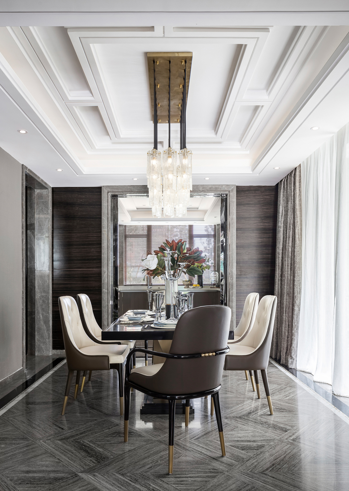 餐廳是分享美食、與家人情感交流的重要場域,造型穩重的家具為空間注入一份恰到好處的儀式感,水晶燈下清透的餐具細節營造了明朗豁亮的用餐氛圍。