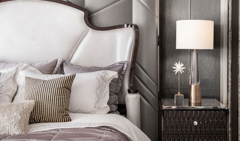 主臥視覺上選擇更為低調雅致的色彩,湖水藍色絲絨沙發質感上乘,造型優雅而復古,清雅細膩的布藝和點睛的水晶裝飾透露出主人的時尚品味。