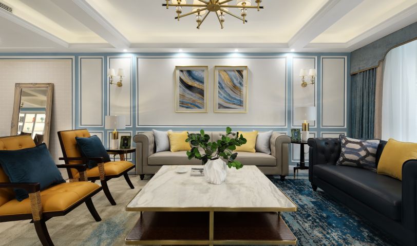 客廳以米白色的背景與藍色的護墻線條打底,留白的設計手法表現空間的視覺效果。壁燈與洗墻燈的完美配合,保證整體照明節奏。在家具的選擇上,用磨砂面的皮質沙發與大理石茶幾將輕奢質感歸于生活。