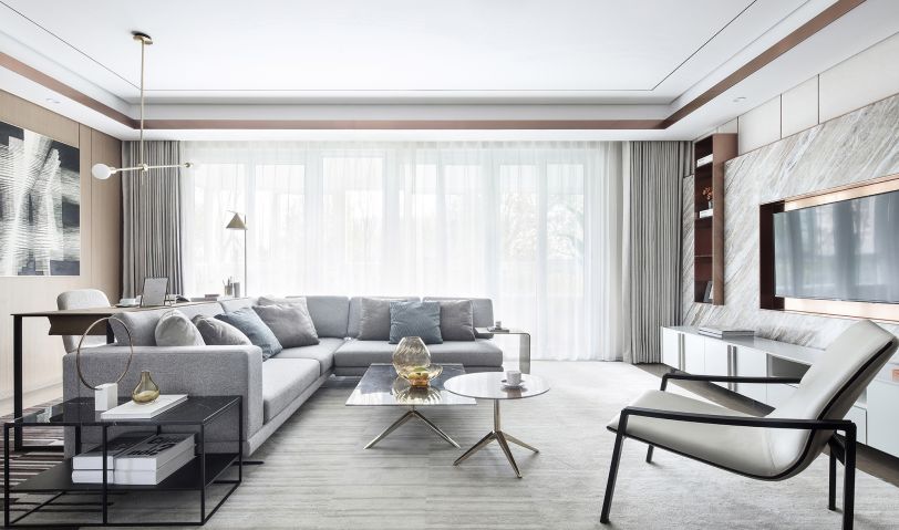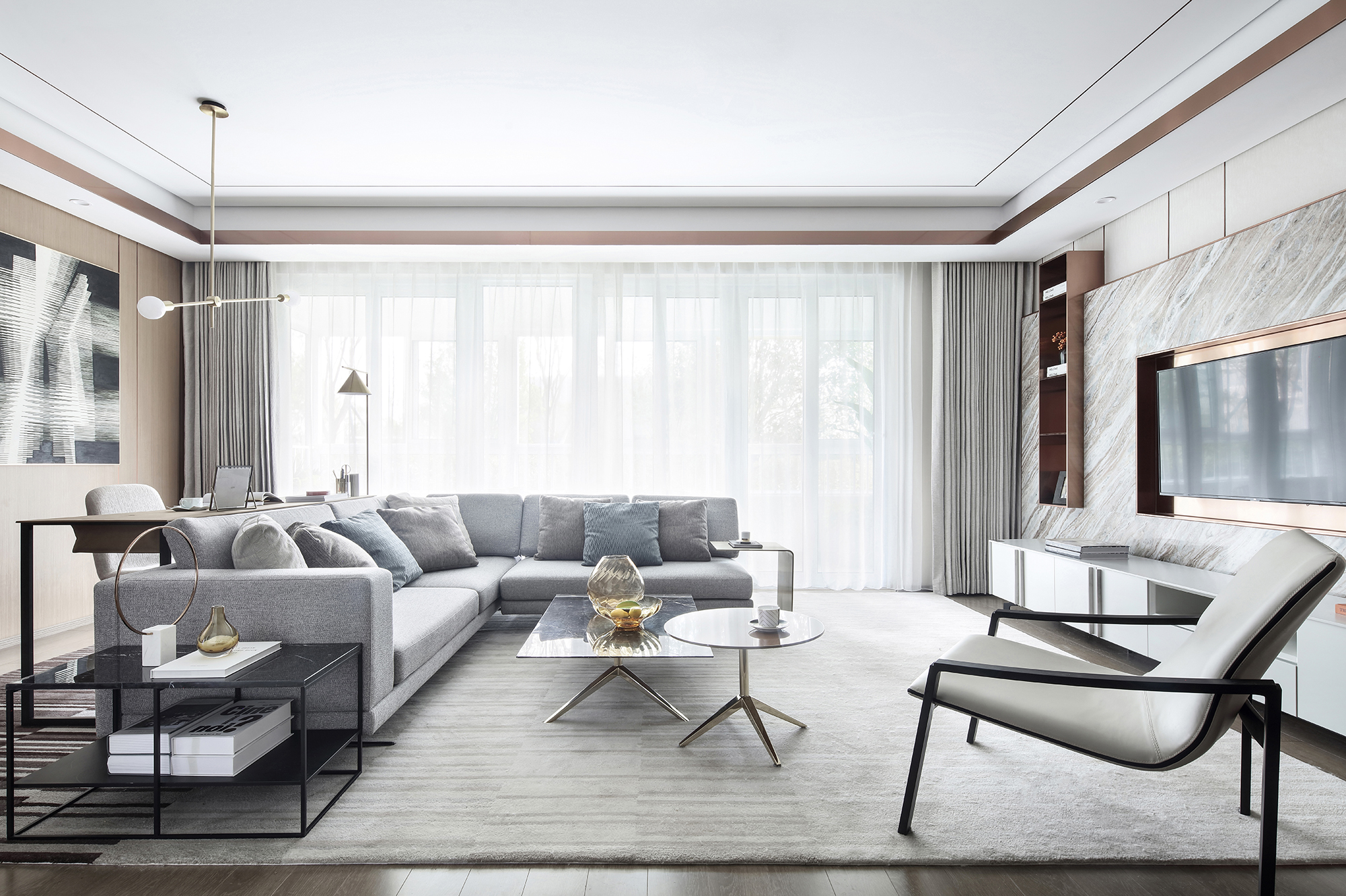 客廳兩端背景墻,演繹出金屬與石材、木飾面的碰撞,在體塊穿插間傳遞出生活的動態與平衡的哲學。