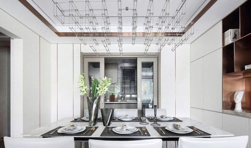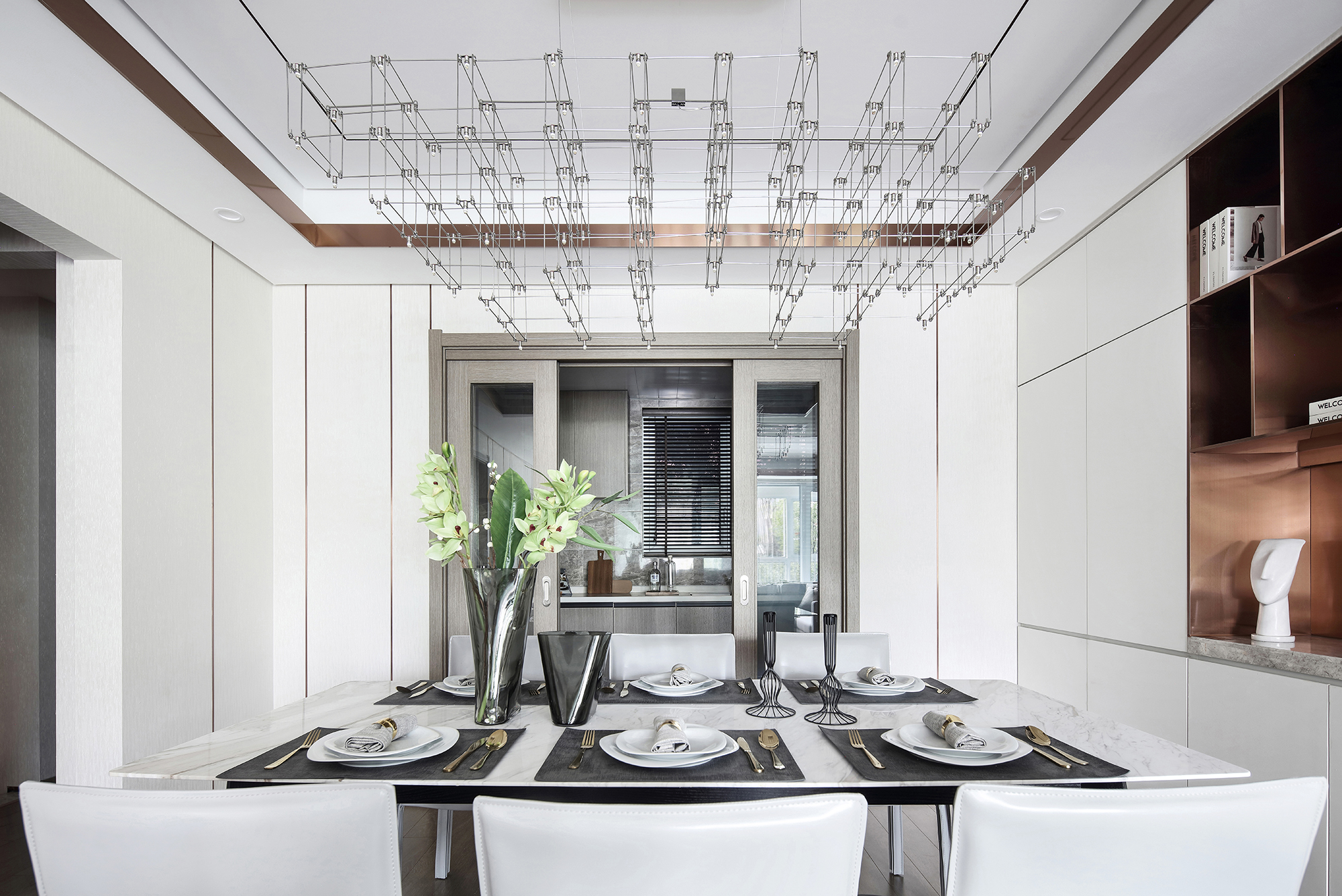 以白色打底襯托出餐廳理性時尚、干凈爽利。零散造型的燈懸于桌面,和金屬線條、方形布局形成一種和諧之美。并且與主色調相近的餐桌椅,保證與立面視覺協調。