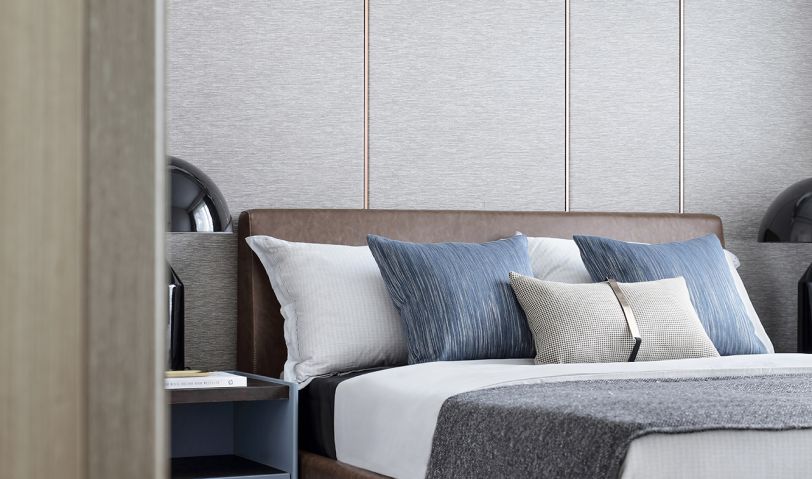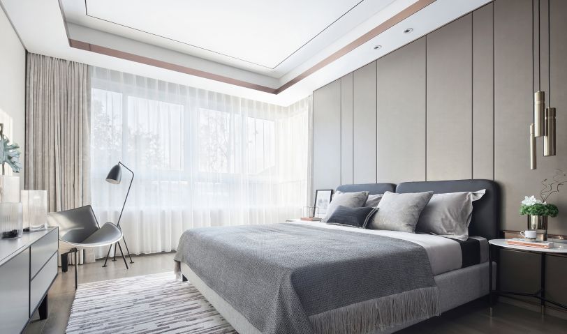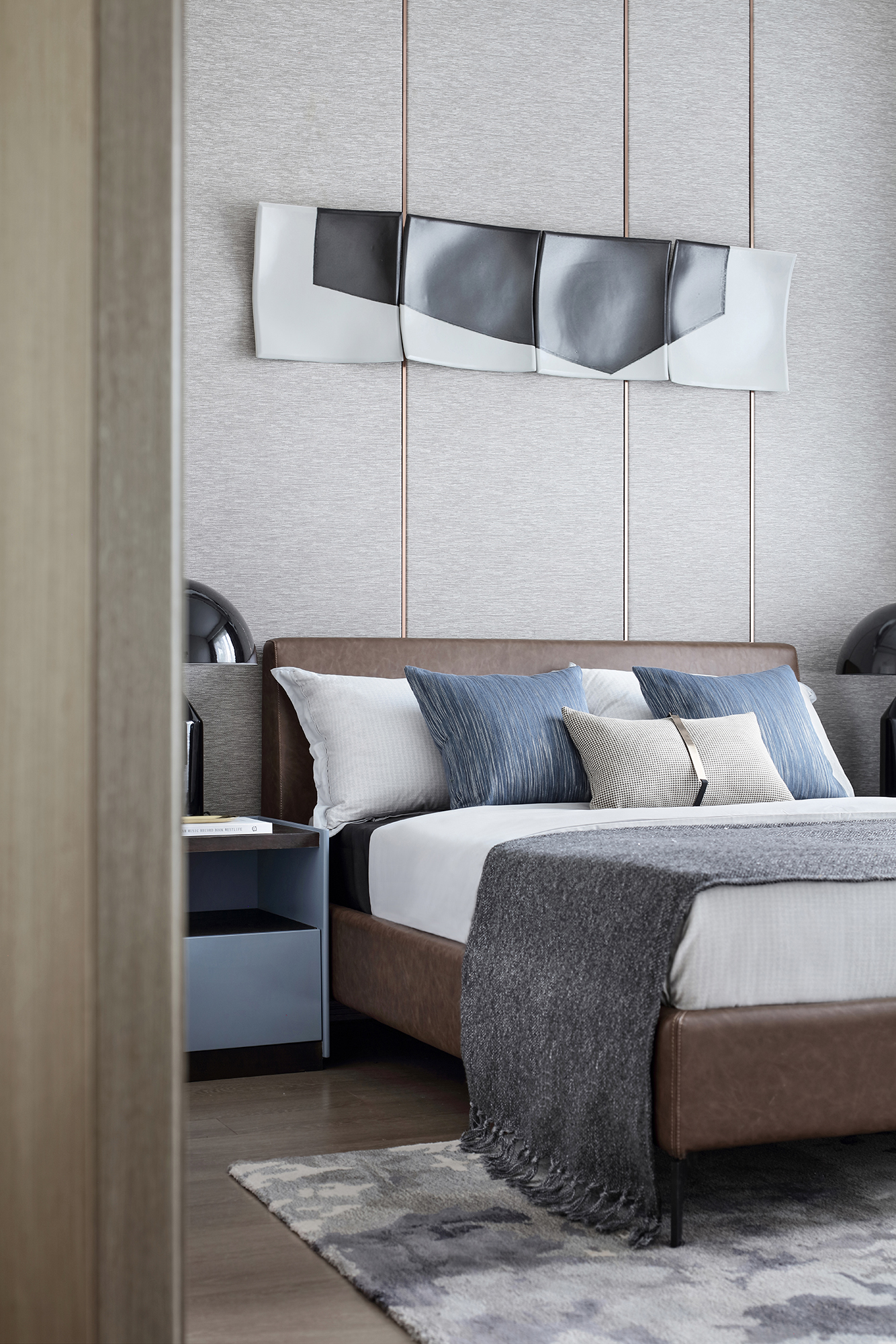 主臥頂面、立面均可見客餐廳的手法,呈現沉靜理智。吊燈與落地燈呼應,表現出細膩的質感層次,于時尚別致中暗藏迷人細節。陽光緩緩滲入,溫暖流淌。