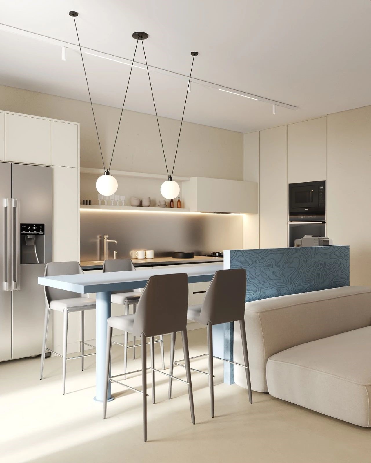 餐廳是廚房島臺(tái)的一個(gè)延伸,藍(lán)色的島臺(tái)以及灰色餐桌成為整個(gè)公共區(qū)域色彩的點(diǎn)綴,W 型的吊燈在餐桌的上方滿足照明的同時(shí)成為上半部分空間的裝飾。