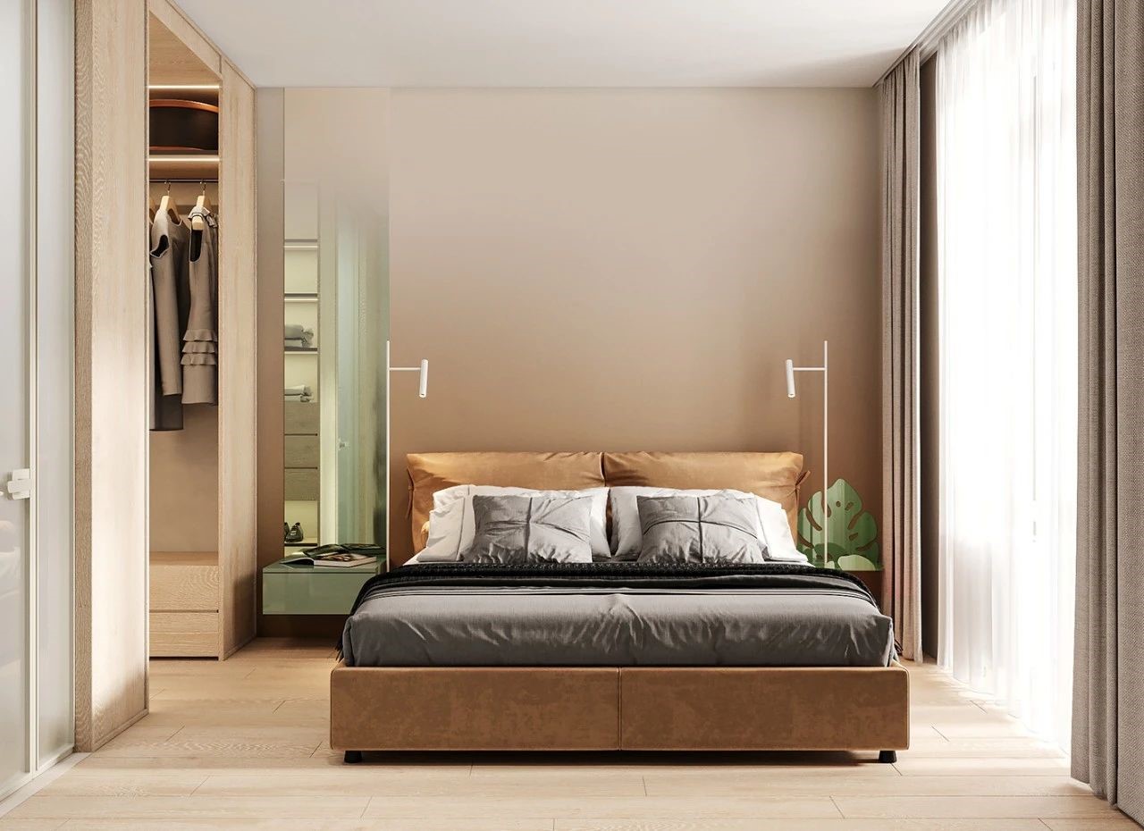 選擇了咖色和薄荷綠來打造主臥空間,短絨的床架和蓬松的床頭是稍深的咖色。