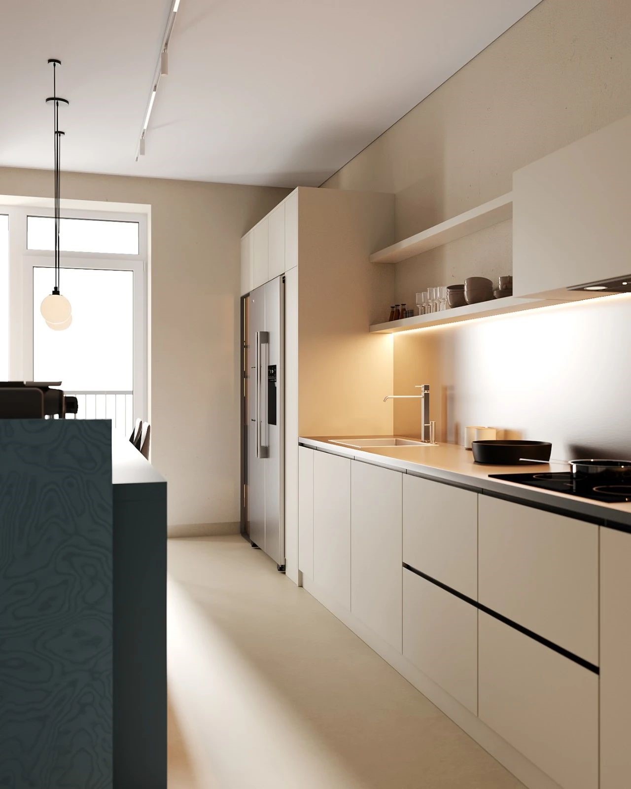 廚房的部分又回到了淺色系,顯得簡(jiǎn)約卻不缺乏設(shè)計(jì)感