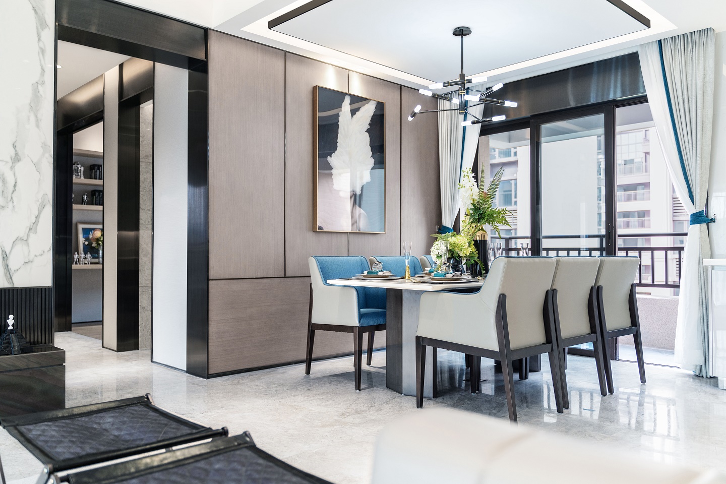 擁有絕佳采光的客餐廳中,一桌、一椅,均凝聚著空間的形與神,見證著戶外庭院的四季交替。深沉的藍色餐椅,喚醒餐廳的活力。綠植的點綴,營造舒適自然的氛圍。