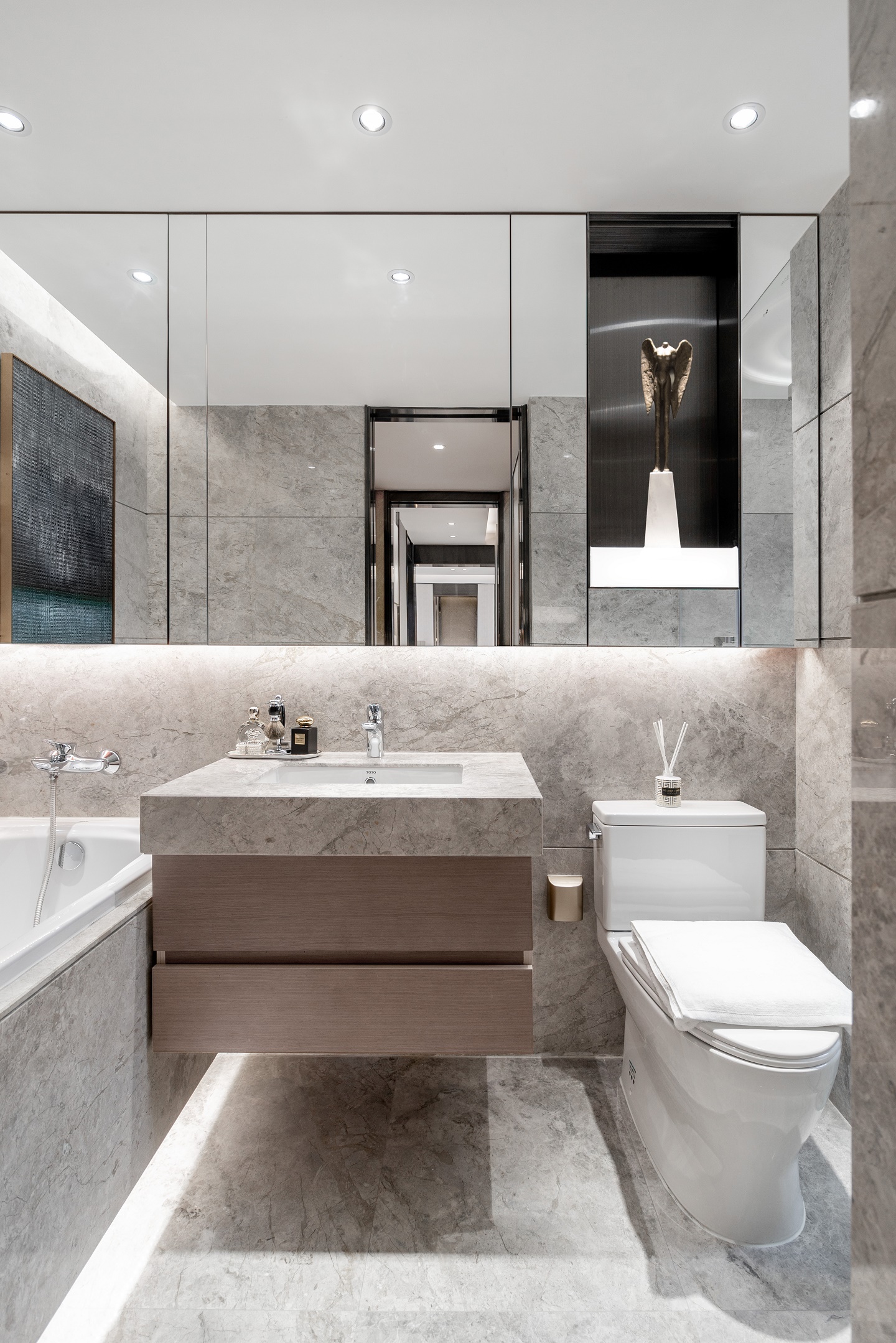 精致實用的衛生間,干濕分離,以玻璃作隔斷讓兩者關系通透。定制一體臺盆搭配鏡面柜門,儲物美觀兩不誤。