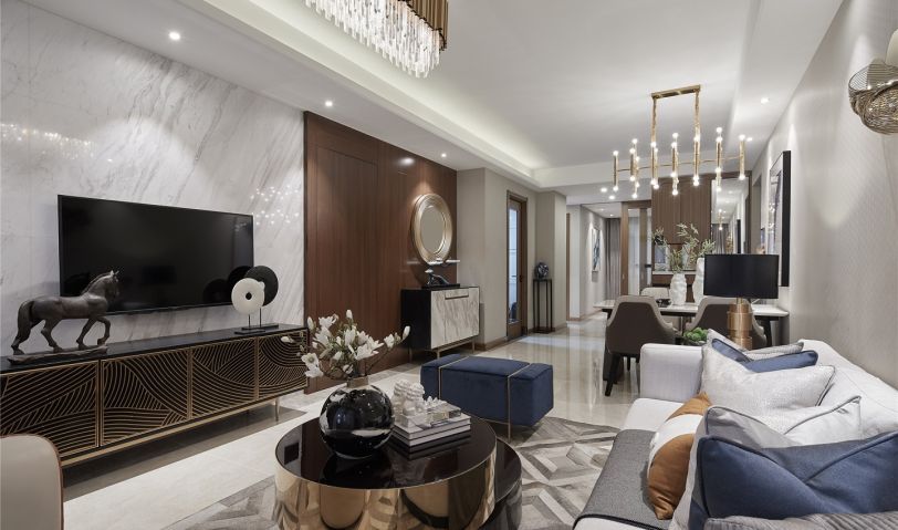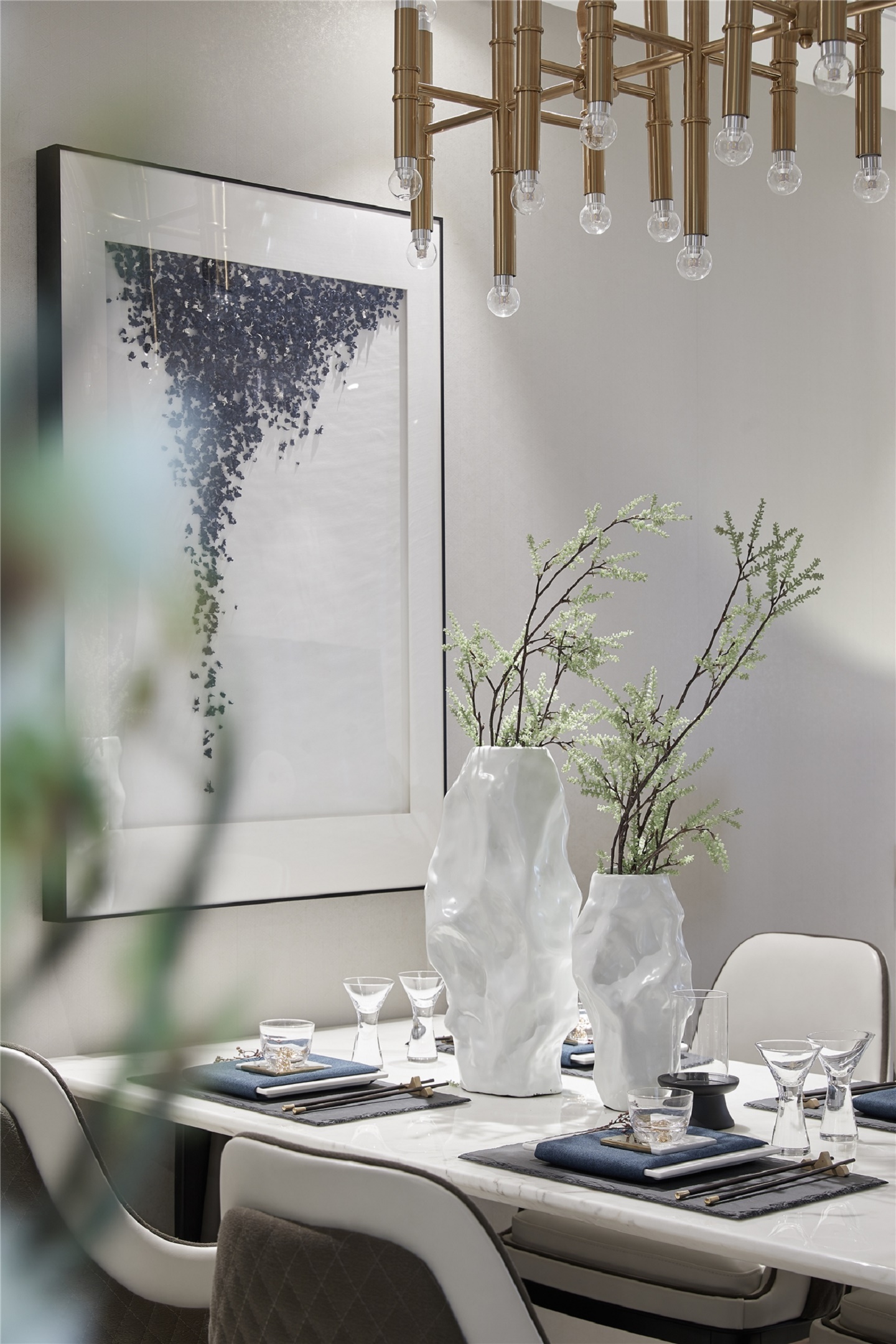 空間布局上從入門處一覽無遺,客餐廳保持空間連貫性,主臥隱于收藏柜后側,保留空間私密性的同時又不至于過分獨立分隔。