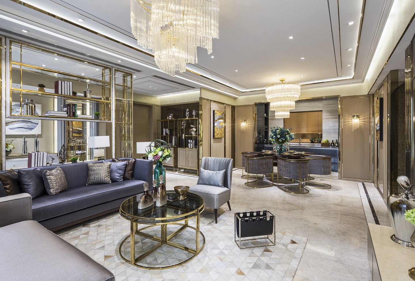 質感石材、高級皮質、鏡面玻璃與鈦金等不同材質靈活貫穿其中,將港式風格獨有的時尚與璀璨從本質上突顯出來,深淺結合的硬包沙發,圍合出生活的品質感。