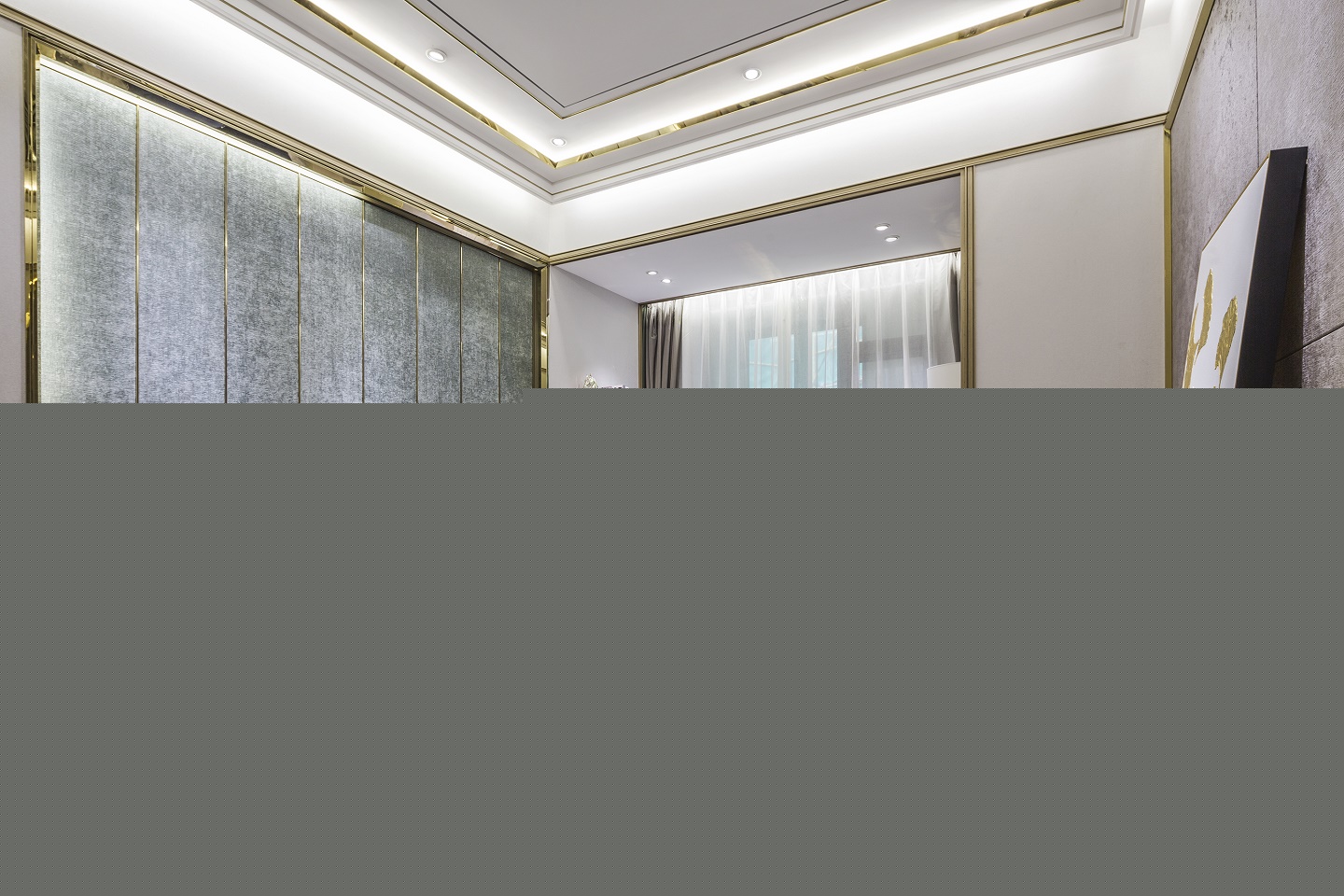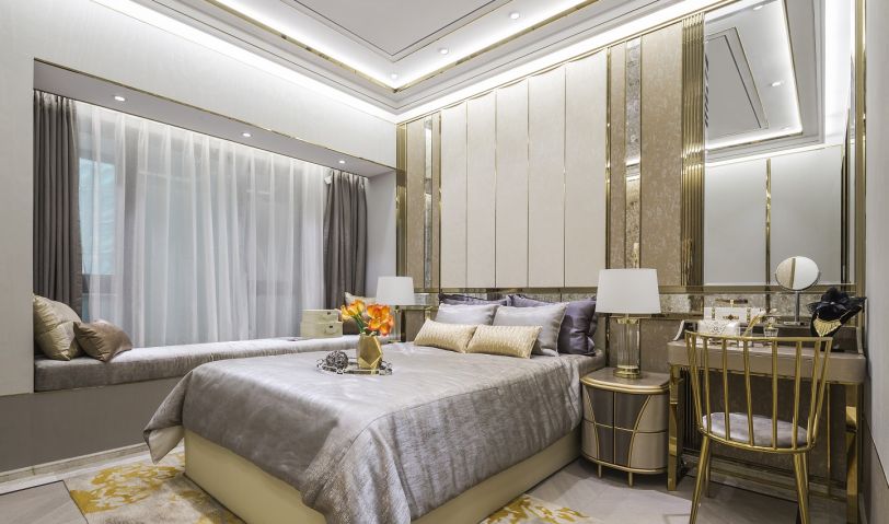 用金色,將之與米黃色結合構成空間的主調氣質,奠定清華流麗的美感基調,輕奢其形,態度其里。干凈利落的天花陰角線與陽角線平行起落,與墻體的鈦金縱向線條相應,立體感和層次感油然而生。