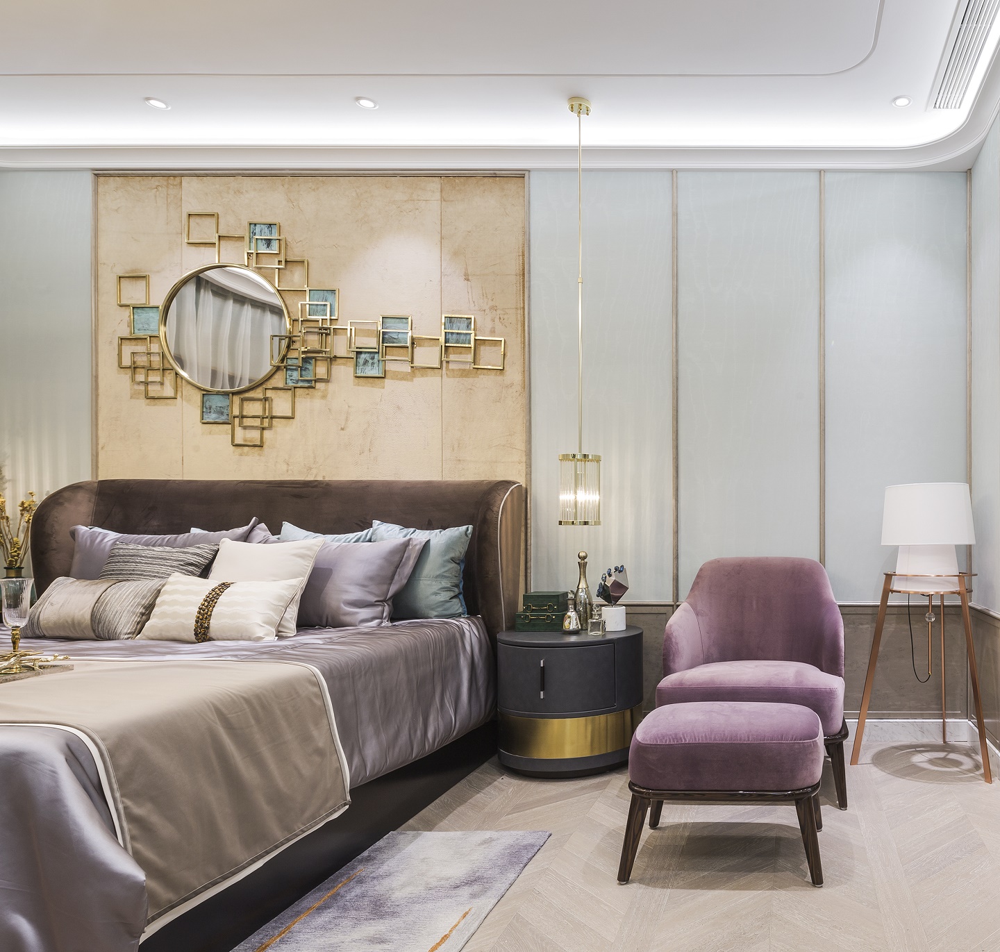 法式風格軟裝是浪漫優雅的必要條件,除卻傳統的繁重與冗余之后,在對稱的軸線排布、細膩而簡約的石膏線、灰色軟包的細節處,我們依然能夠尋覓到法式的精致考究,以一種更貼合現代審美的方式。