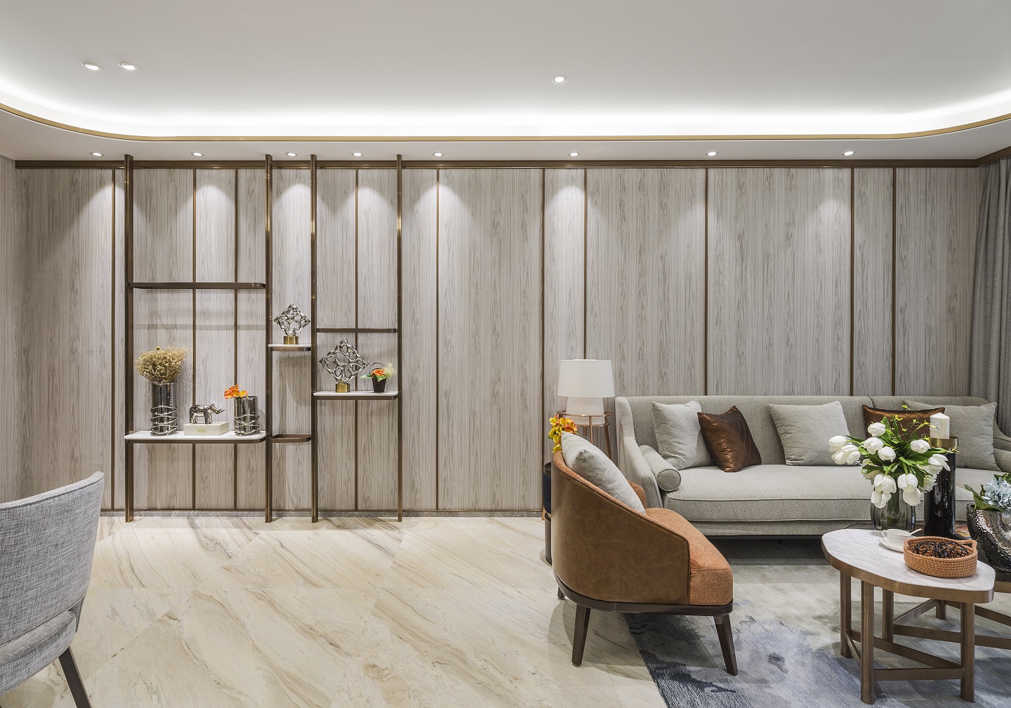 現代風格的簡約利落基調,空間上選用低調的芝麻灰與深沉的古銅色為主色,用典雅而不過度的裝飾,勾勒出現代雅奢生活的精致質感。