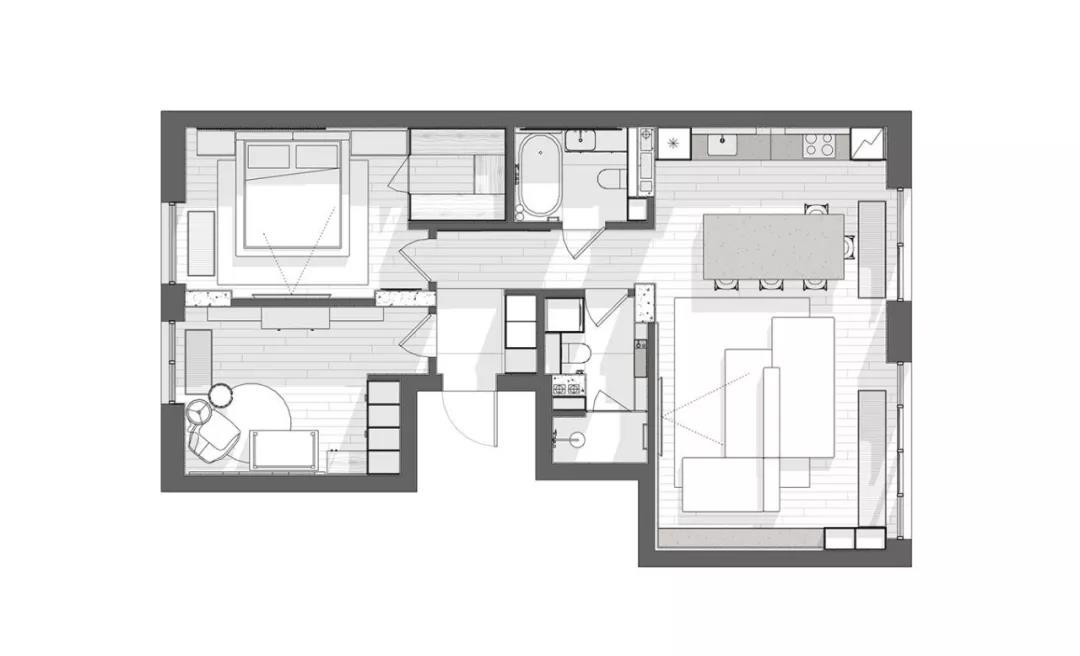 設(shè)計師巧妙地在衛(wèi)生間入口設(shè)置了一扇隱形門,使門與墻體融為一體,打造出完整連貫的視覺空間,減少雜亂感。