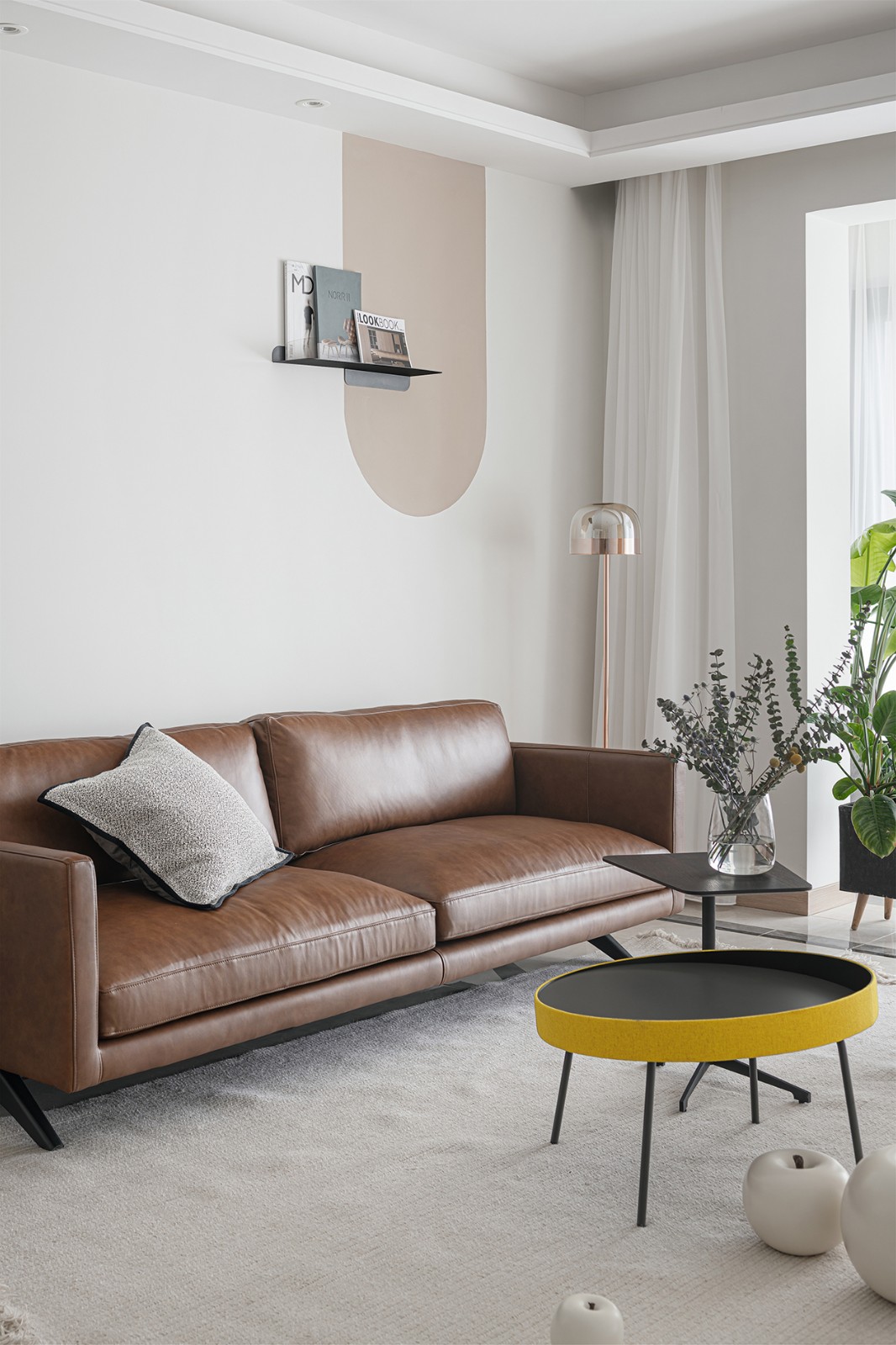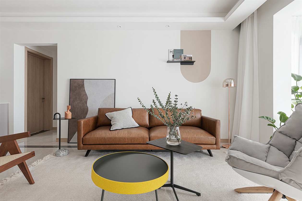 客廳——焦糖色NORHOR沙發(fā)奠定了客廳自然溫暖的基調(diào),背景墻上暖咖色的弧形圖案與裝飾臺讓原本的白色墻面顯得不再無聊單一,與線條簡潔的落地?zé)簟装复钆洌嗟靡嬲茫瑯?gòu)成了一幅純粹而富有質(zhì)感的畫面。