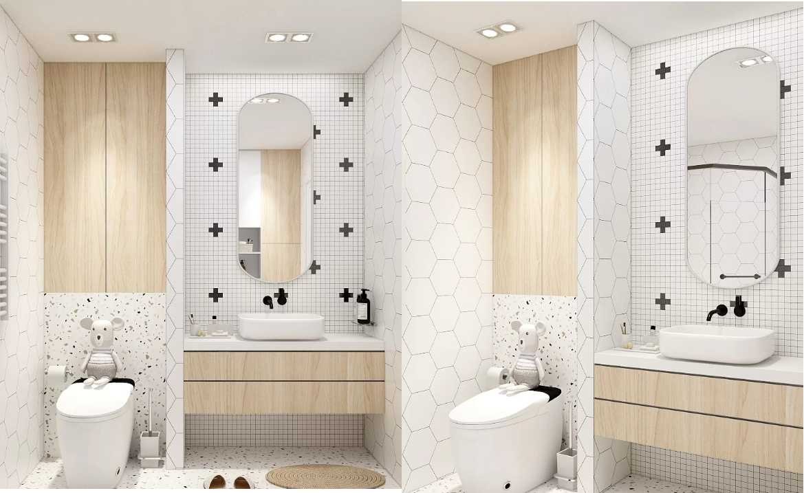 衛(wèi)生間采用白色和木色搭配,磚選的非常用藝術(shù)
