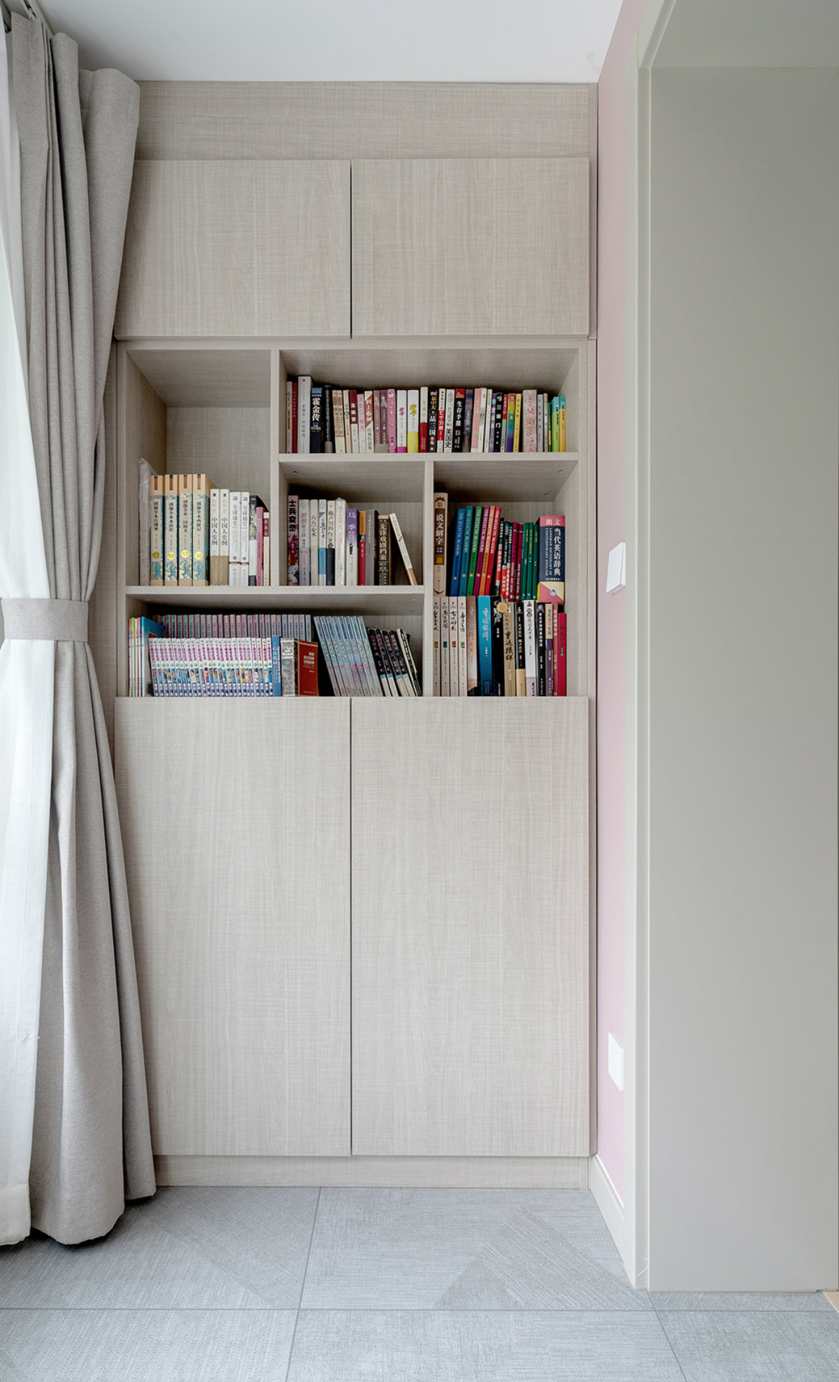 主臥進門處看,空間也是比較通透的,絲毫沒有因為深色玻璃,帶來的壓抑感。背景墻刷了暖灰色漆,再配合原木和灰色亞麻布藝,暖到心里了。