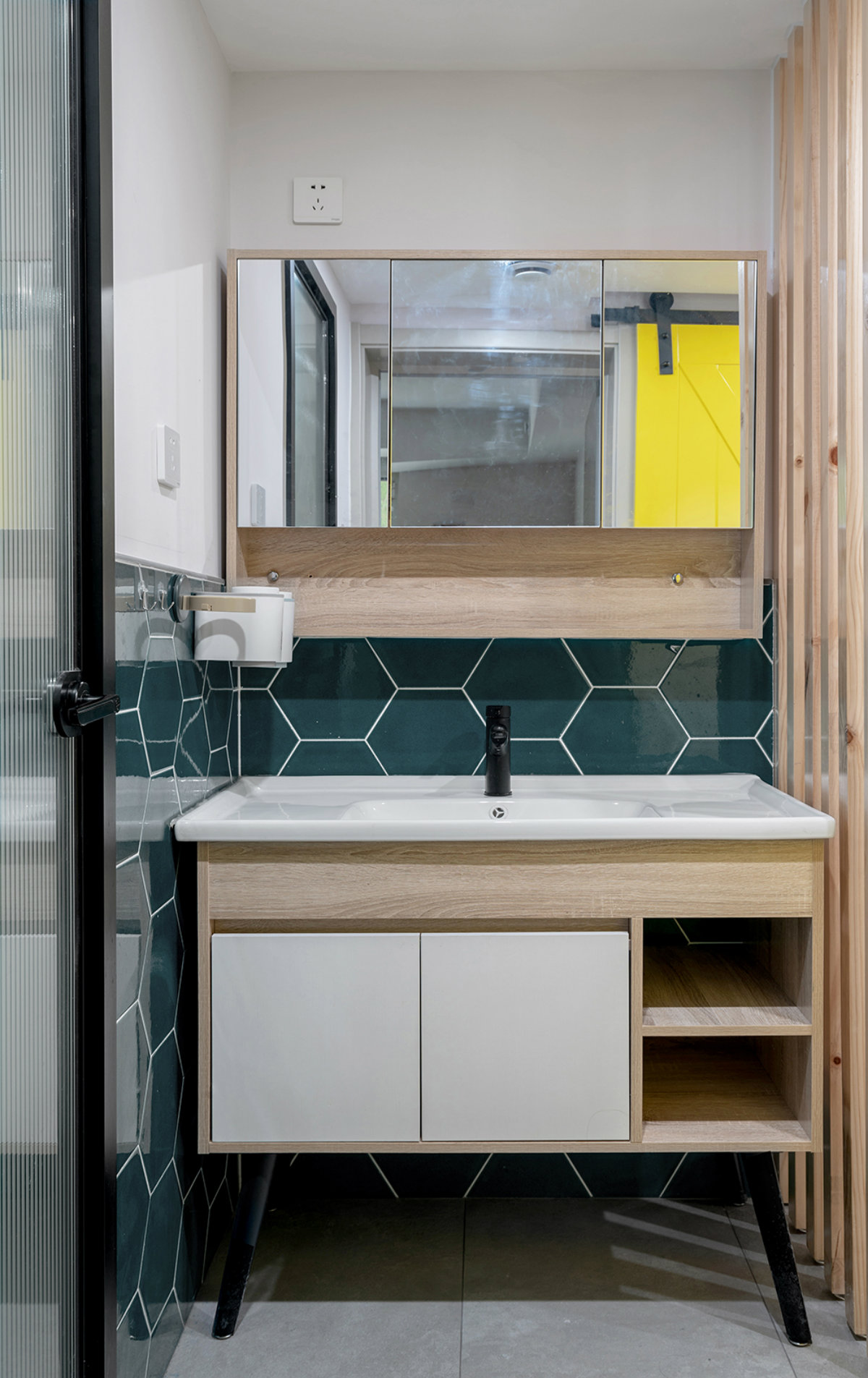 洗漱區放到了外面,這樣衛生間里外的功能,可以同時使用。側面安裝了屏風,這樣就不會進門一眼看到手盆,保持了進門玄關的美觀和完整性。用墨綠六角形瓷磚做點綴,高度上則是只貼到了半墻。其實像這樣的空間瓷磚不用貼通太高,可以只貼鏡柜后面,或者3面。上部可以刷防水漆進行拼接裝飾,裝飾彈性和選擇性都很大,完全可以根據自己的喜好來設計這個角落。衛生間加入了不小的按摩浴缸,特意在千挑萬選中找了這款扇形的,這樣可以保證里面空間的動線流暢。地面鋪設地磚的時候,特意做了凹凸紋理和防滑處理。防腐木安裝在淋浴房區域,與外面的地磚正好平齊,光腳踩在里面也不會涼。