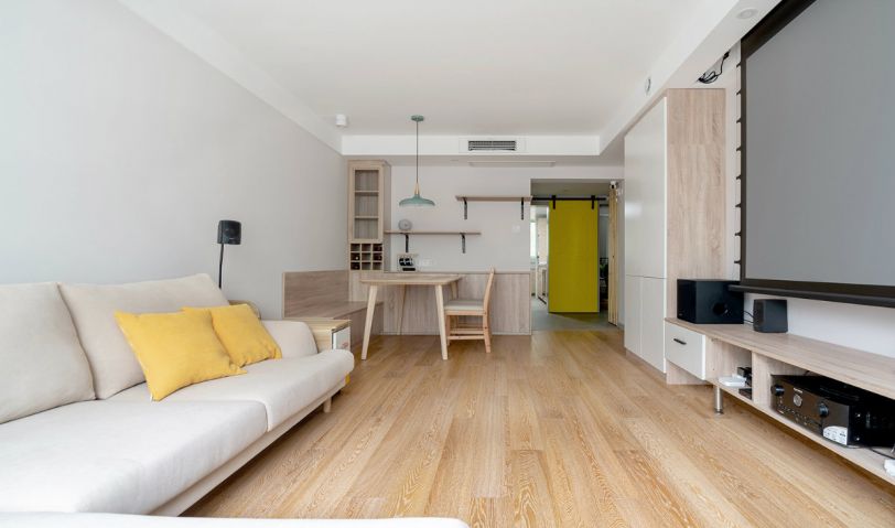 原木和亞麻的搭配是一個經典,氛圍感十足。同時轉角沙發的利用也讓客廳的活動空間變得更大,方便在客廳做一些運動和鍛煉。姜黃色的點綴,讓原本比較溫馨平淡的空間,多了幾分跳脫和活躍。