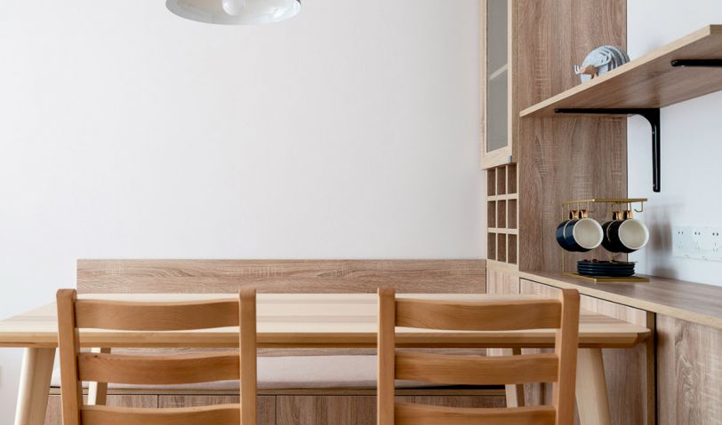 卡座一直是小戶型的不二之選,空間利用絕對高,還能增加儲物和收納。餐桌邊上設計了餐邊柜,平時的一些小電器方便使用,紅酒還有收藏的一些杯子也有空間展示。簡潔自然,給人的感覺就會是舒服干凈,沒有絲毫違和感。