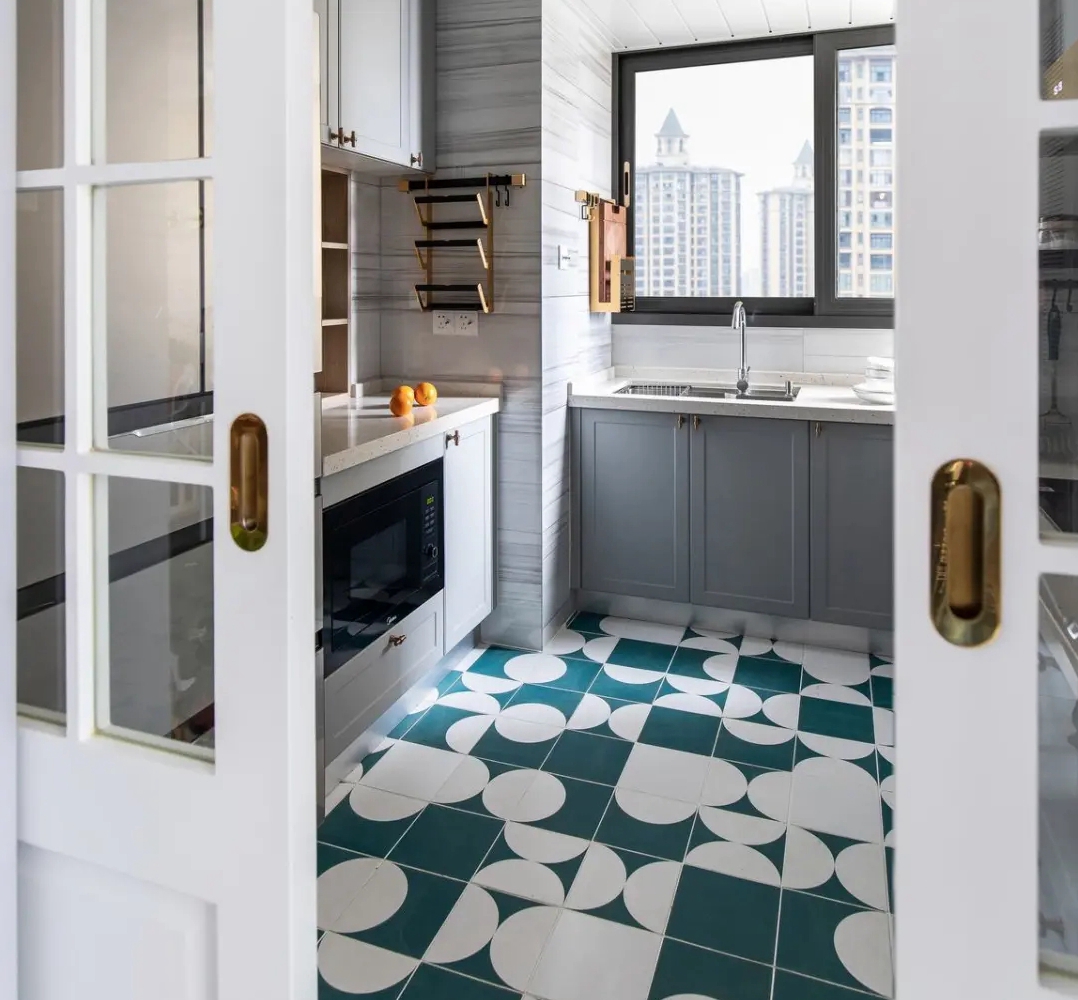 廚房地面是青白拼色的花磚,定制灰色櫥柜,在L字形的操作臺下,為主人帶來了一個明亮文藝的烹飪空間環境。