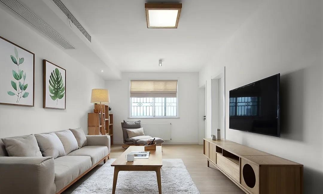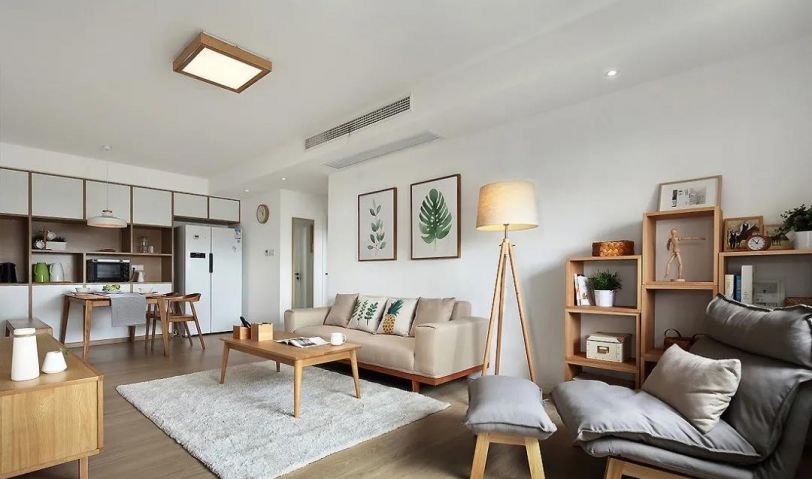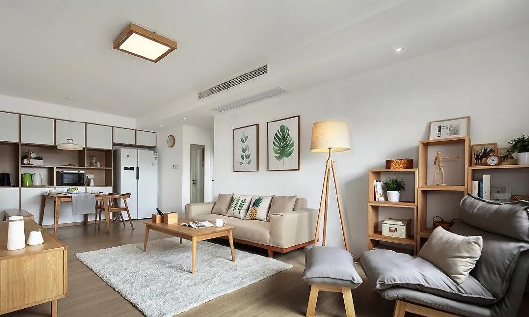 客廳區域整體的硬裝設計,主要是以白色為主色調,家具主要以原木的為主。