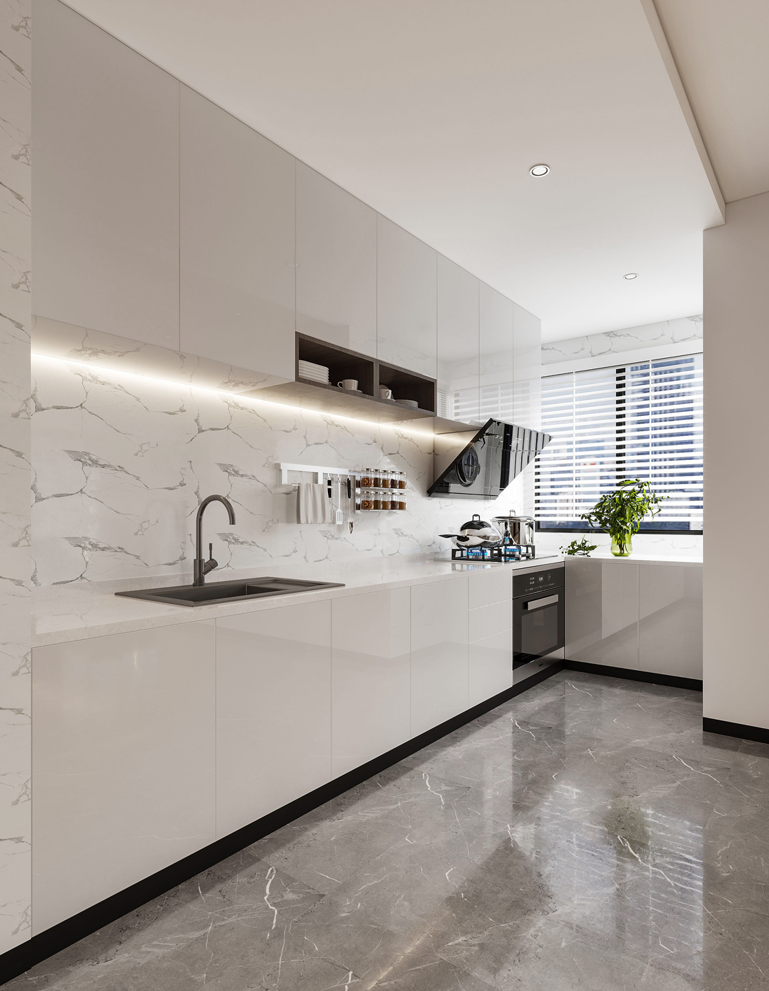 廚房面積不大但光線很好,采用開放式廚房L型動線布局,留出獨(dú)立的冰箱位置把充足的操作面積和收納空間給業(yè)主