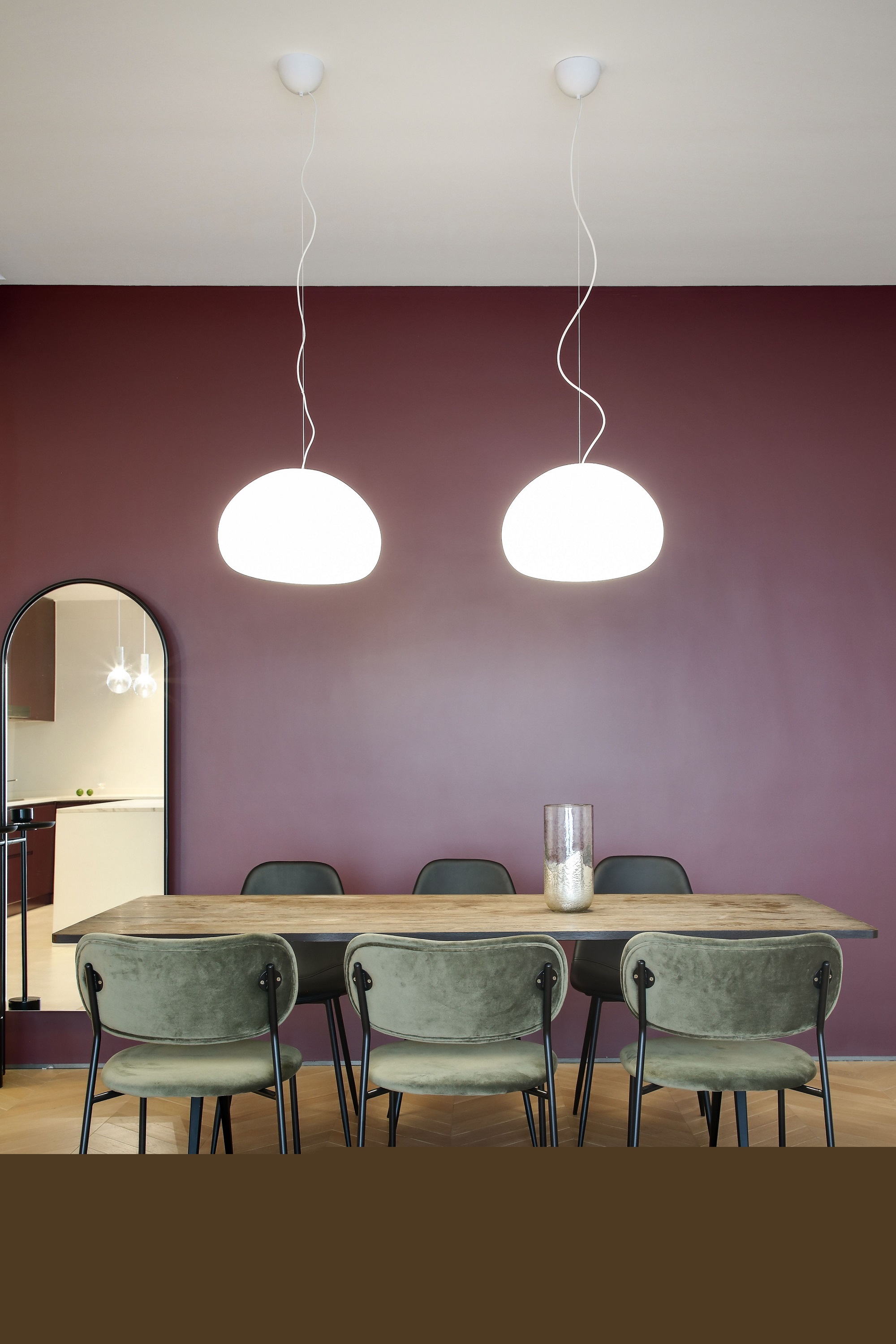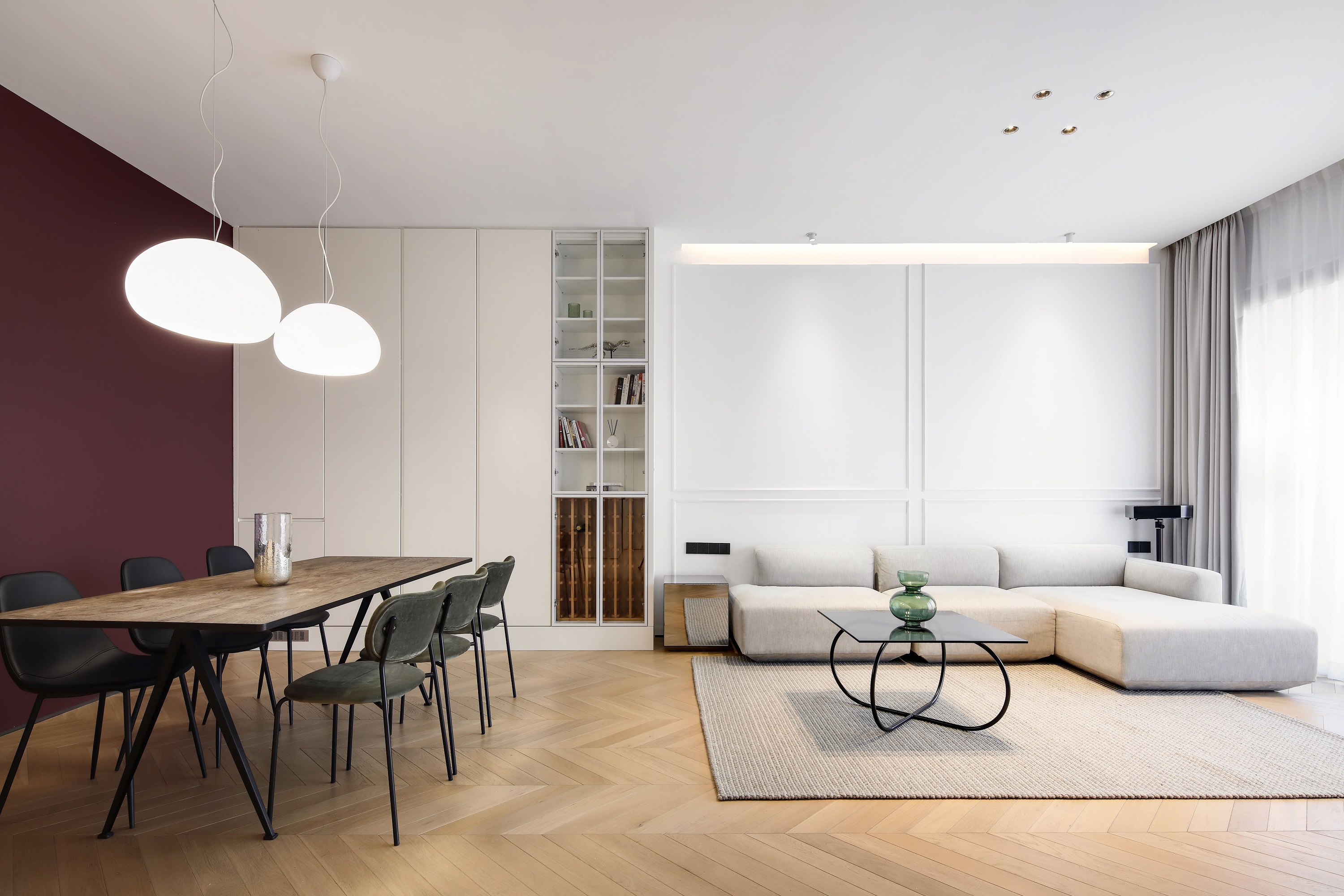 打通墻體后,廚房和客餐廳多了連接,更顯通透。大件家電則選擇“隱身”,空間姿態更輕薄簡約、收納力足夠,同時延續著瑪薩拉酒紅和風暴綠的撞色氣質。