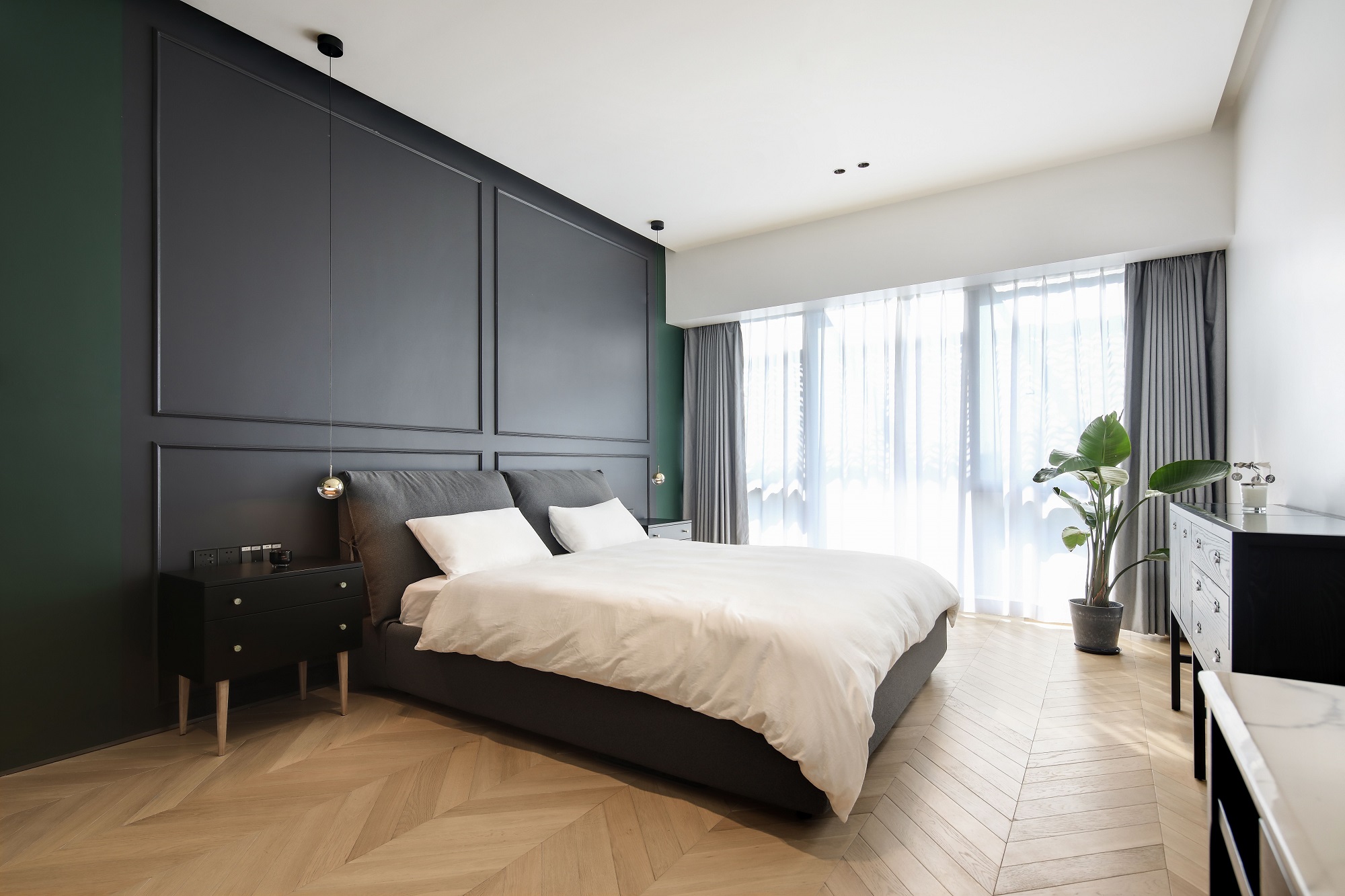 悄然推開門,寧靜的色彩掠去心中浮躁,暖色的魚骨拼木地板調和出空間的平衡,飄逸的白紗,清風拂過,就好像輕柔地吹在心上。拉上遮光窗簾,隔絕喧囂、攏住浪漫~