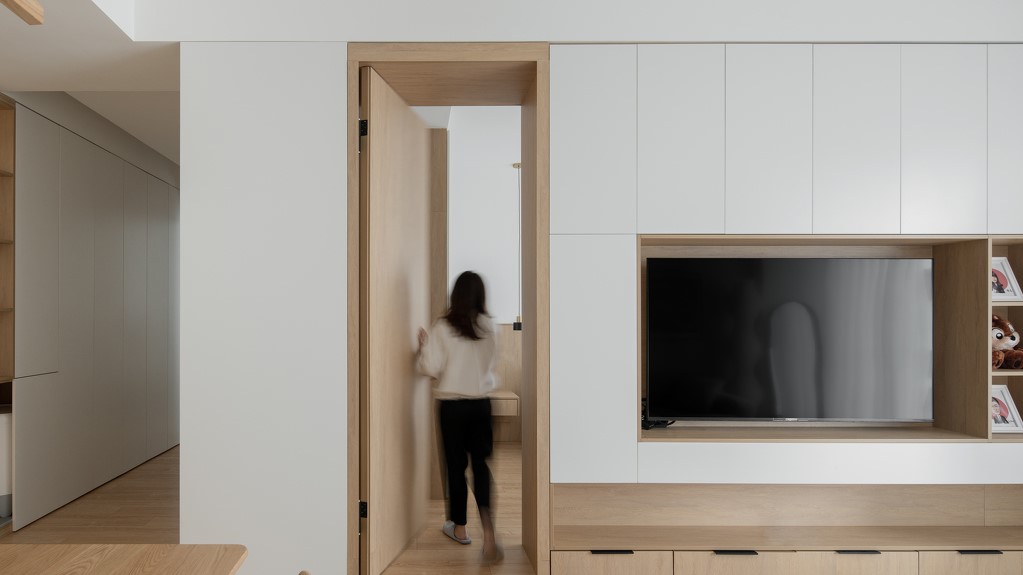 電視墻使用整面的儲(chǔ)物柜,增加收納空間。并將臥室門(mén)隱藏,使整個(gè)墻面整體干凈協(xié)調(diào)