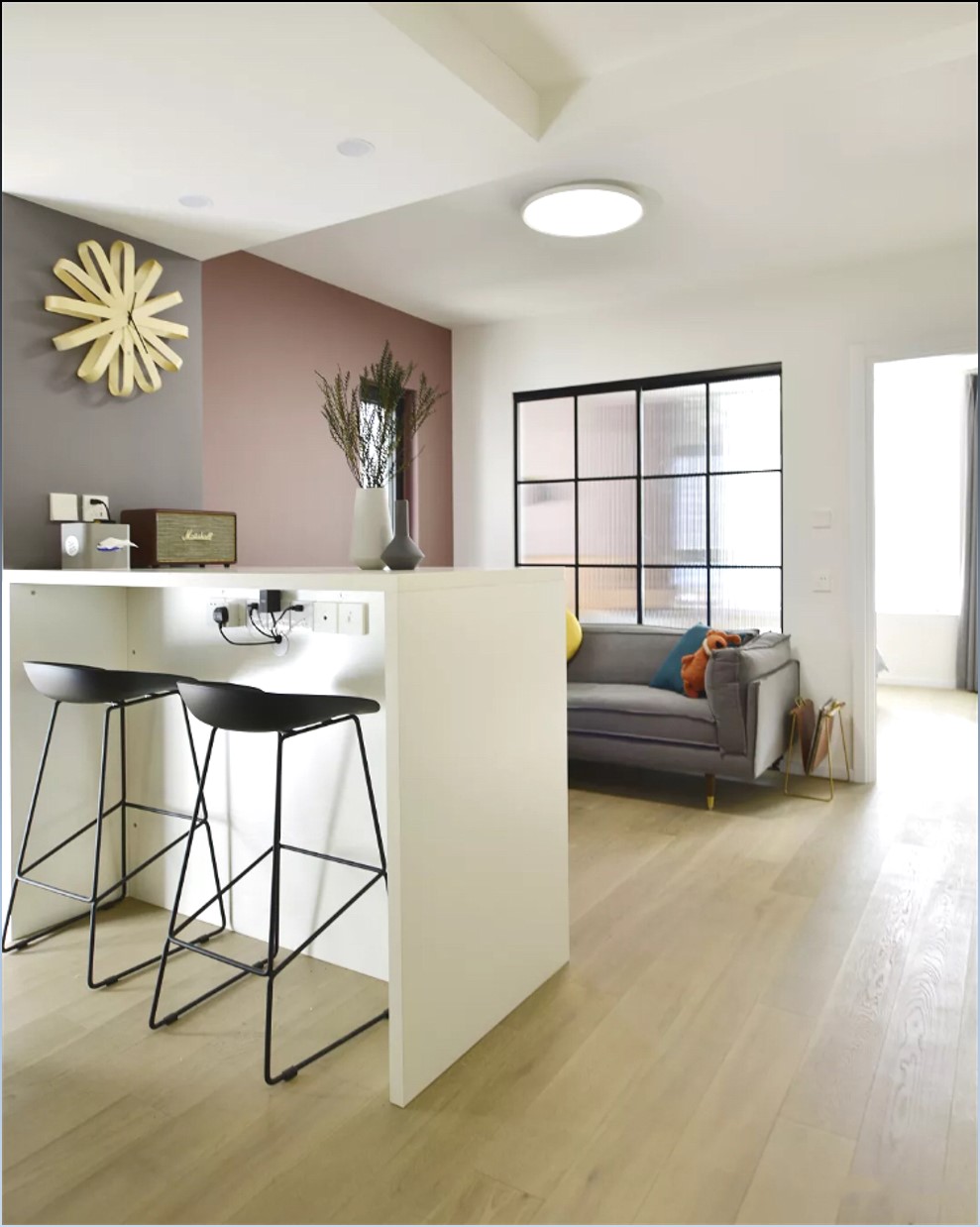 以吧臺作為客廳與廚房之間的過度橋梁,一邊解決了吃飯問題,另一面作為電視柜,功能上利用最大化。