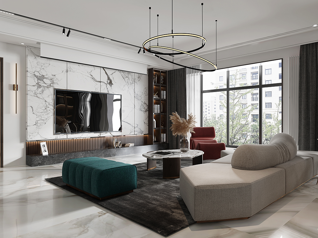 用不規則弧形沙發更好的利用空間,增加了整體的靈動性,大理石石材電視背景墻嵌入極光電視,整體簡約又大氣。