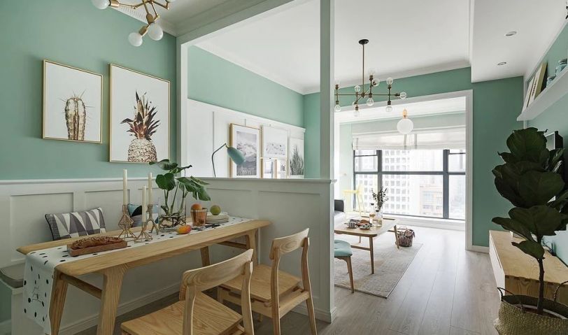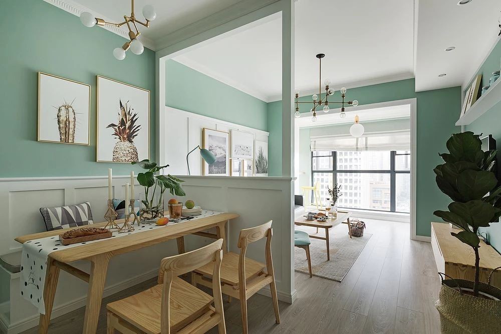 不太寬敞的客餐廳空間通過增加一個半高隔斷區(qū)分了出來,在不影響采光的情況下又使餐廳擁有了可以收納物品的卡座