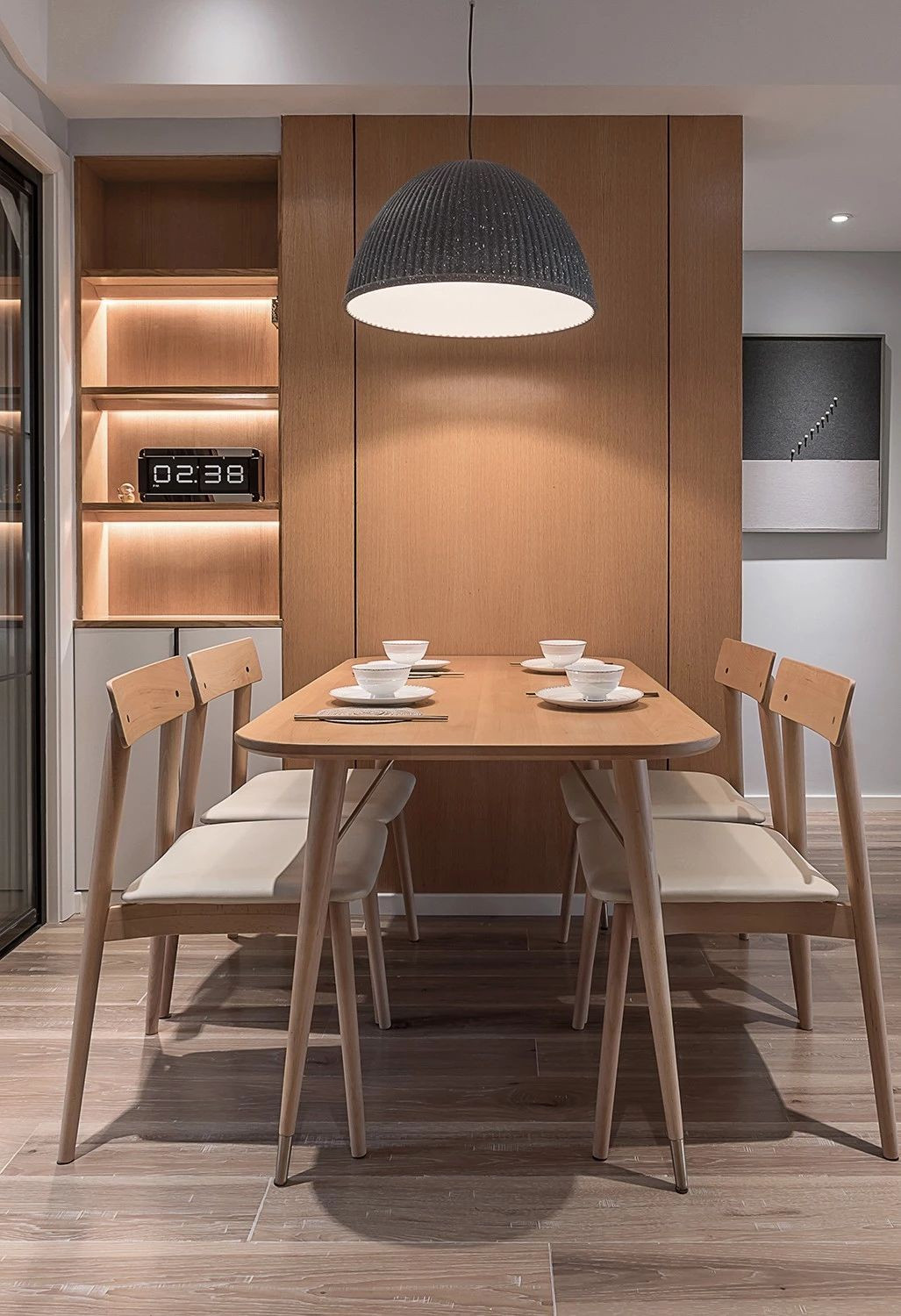 入墻設(shè)計(jì)的餐邊柜收納與展示功能兼?zhèn)?,展示格中還做了藏光設(shè)計(jì),營(yíng)造溫馨舒適的用餐氛圍。