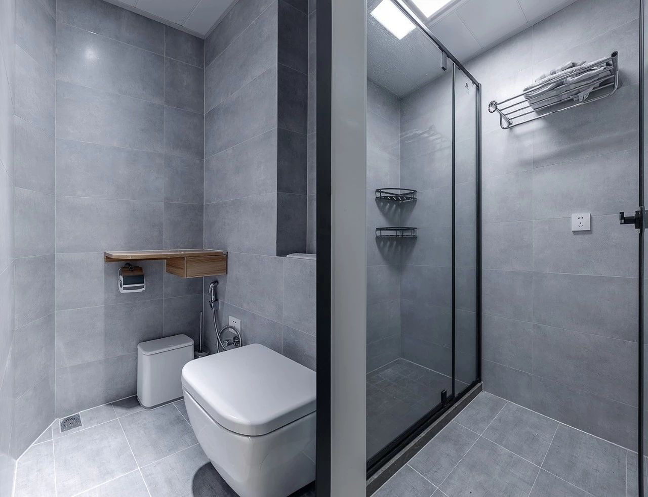 衛(wèi)生間內(nèi)部則是以水泥灰質(zhì)感的墻地磚打造,充滿了工業(yè)風(fēng)的年輕時(shí)尚感。
