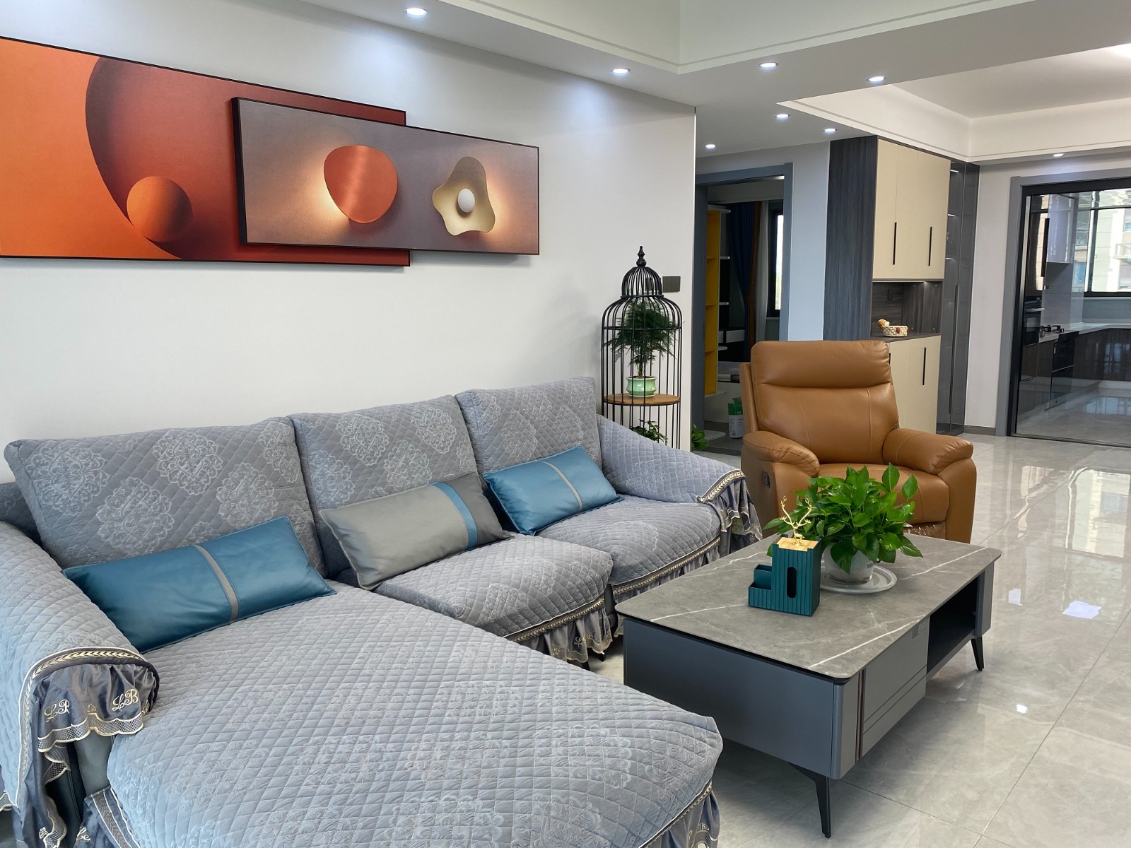 客廳整體簡約大氣,白色的沙發背景,因為藝術畫的存在更具神秘藝術元素,搭配布藝沙發,整體通透
