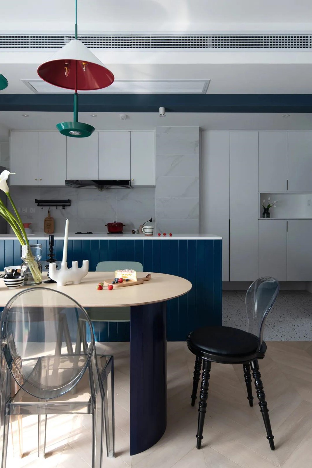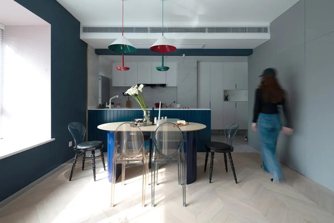 餐椅選透明亞克力材質的,讓空間更為輕盈與通透。混搭的餐椅在形狀上與餐桌亦作了呼應,豐富且統一。