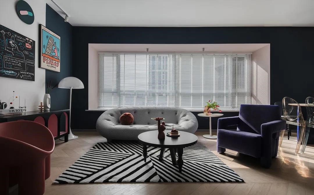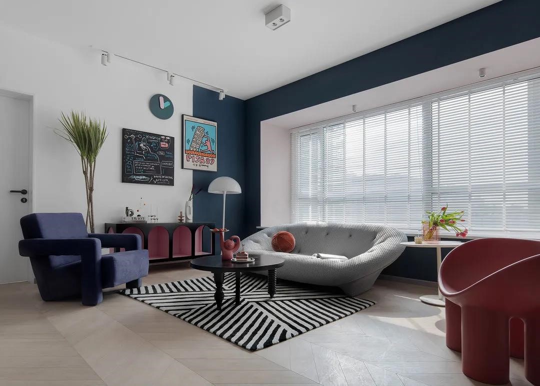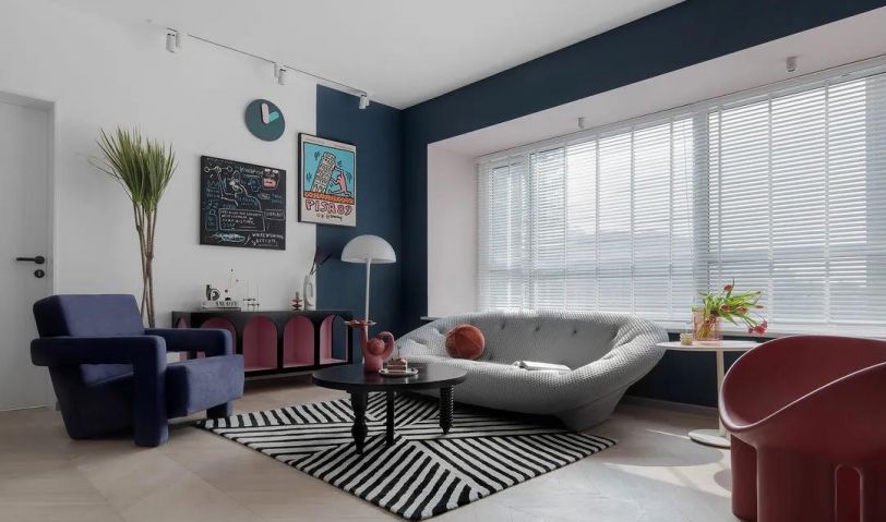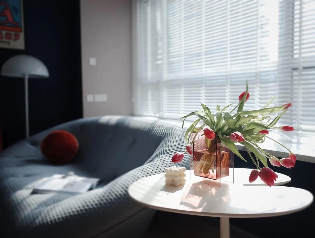 飄窗選用百葉簾,利落干凈,可根據需求靈活調節光線,沙發與裝飾柜均為成品,空間靈活可變