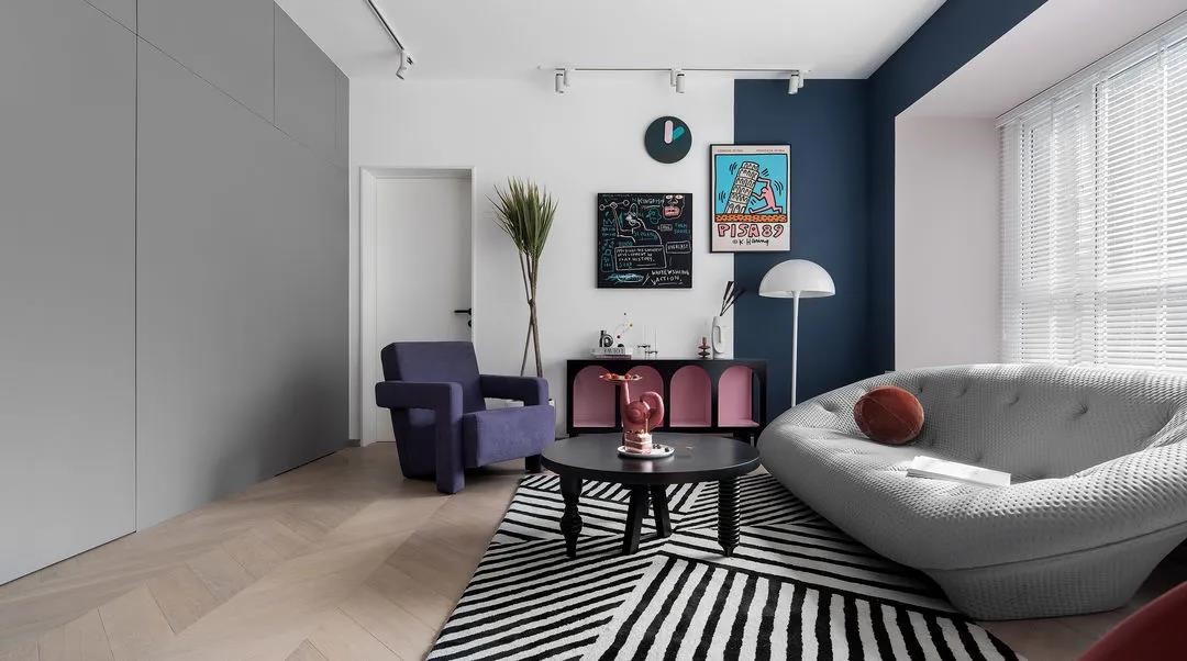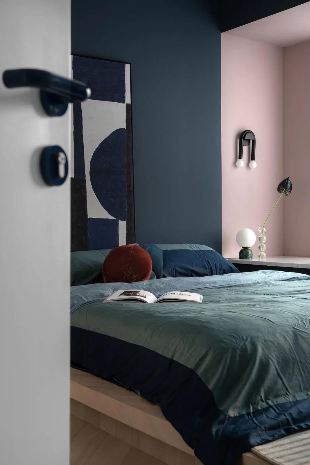 主臥門選擇了極窄2公分門套線,在白色的墻面上比較弱化,盡量減少門對于客廳裝飾墻面整體性的影響,再點綴了比較跳脫的藍色門把手,與墻面色彩呼應,實用與顏值并存。同時藍色門鎖有起到空間承上啟下的作用,從客廳的藍色系連接到主臥的深藍背景墻。