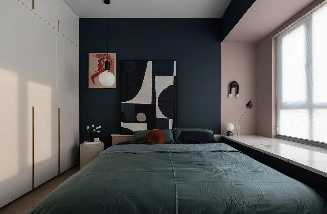 在色彩搭配上,選用讓人比較沉靜、有助于睡眠的深藍,作為臥室的主基調,再配以安寧溫暖的橡皮粉作為輔色,同時白色柜體減少了空間的擁堵感,讓空間色調也更為的明快。